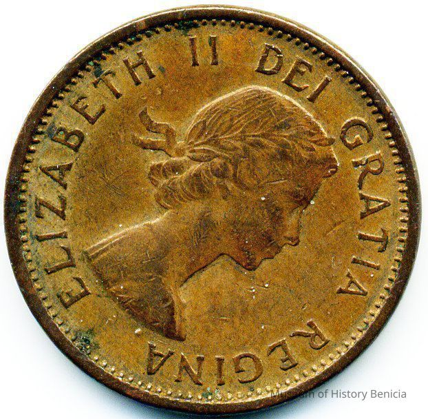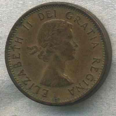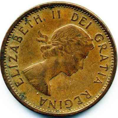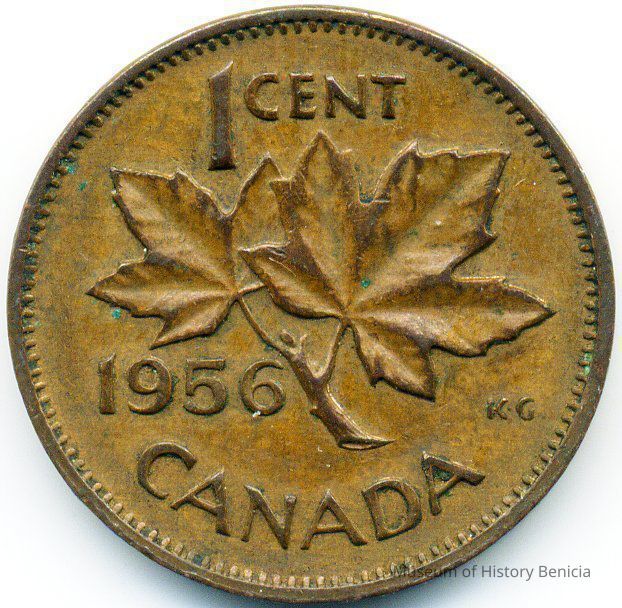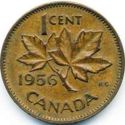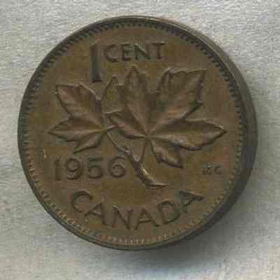 Coin - One cent Canada 1956 - Queen Elizabeth II on obverse and maple leaves on the reverse. size: 3/4" diameter
