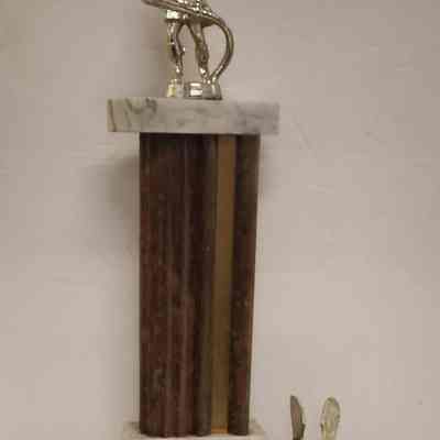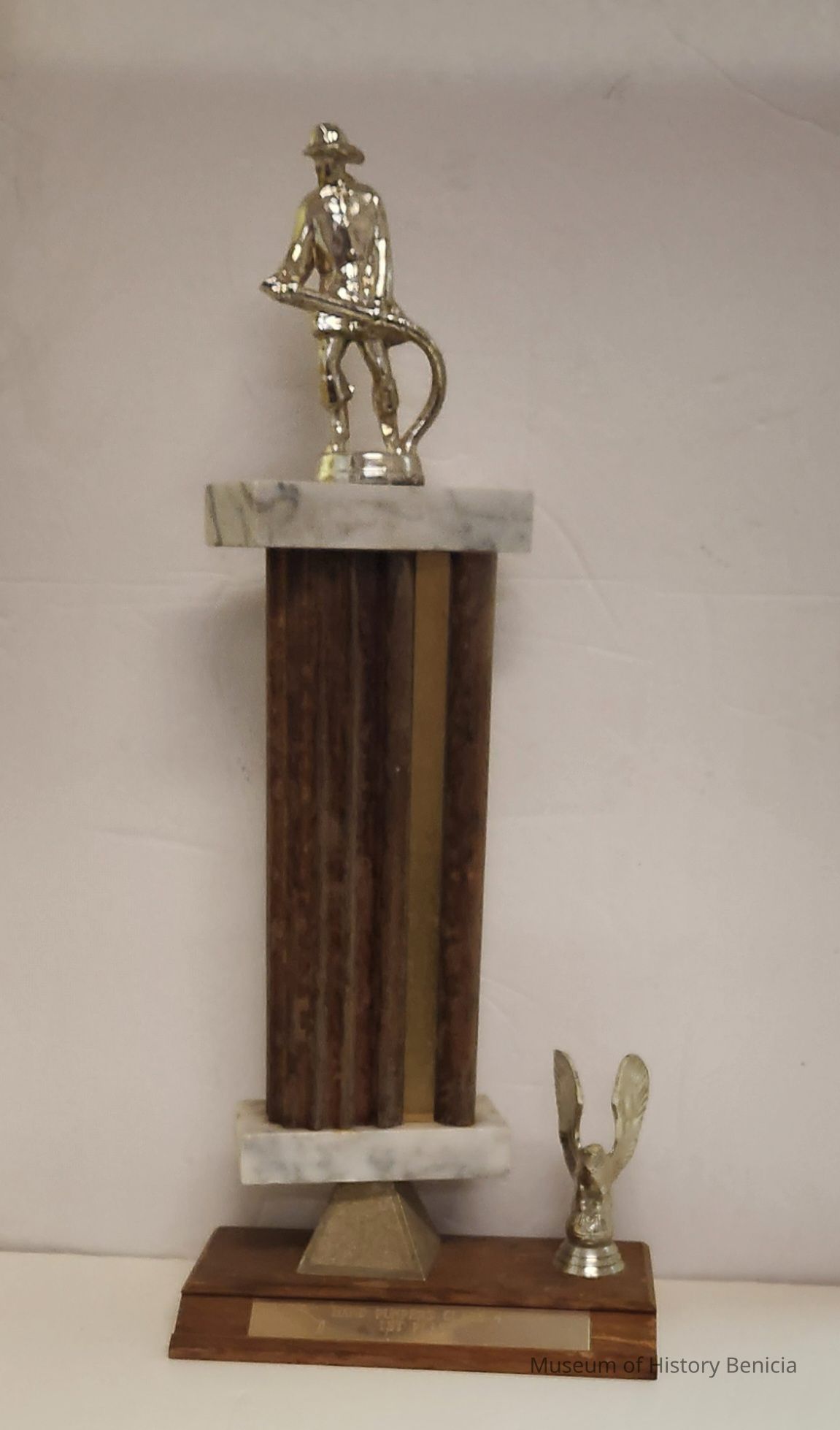 Trophy - wooden base with brass plate on angled front; open winged eagle to the right of the column; column is metal-marble-metal-marble with a fireman figure on top holding a hose. Column colors are brown and gold.Collection
