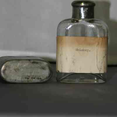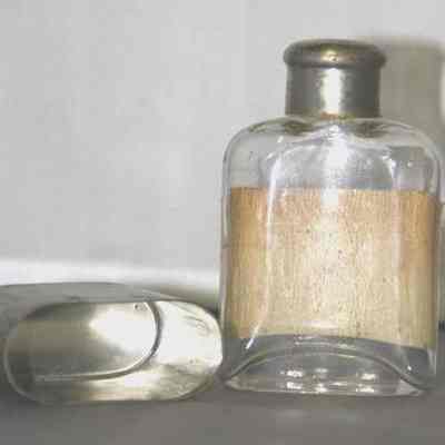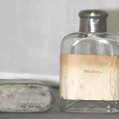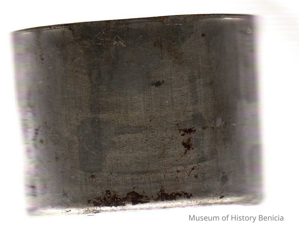 metal cup/case which fits over the lower part of the clear glass medicine bottle BHM 1996.044.0010a