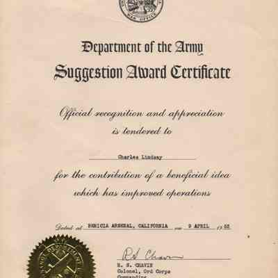 Department of the Army-Suggestion Award Certificate