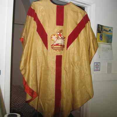 Gold and red Chasuble with lamb decor on the front. Worn by priests at St. Dominics Church in Benicia.