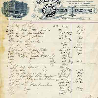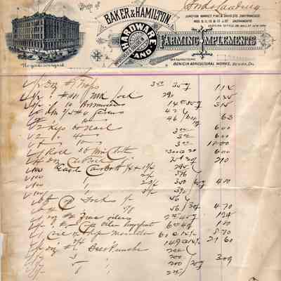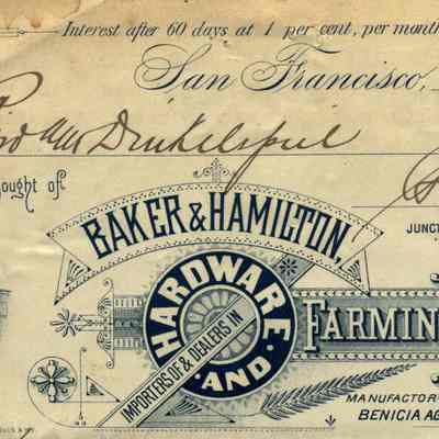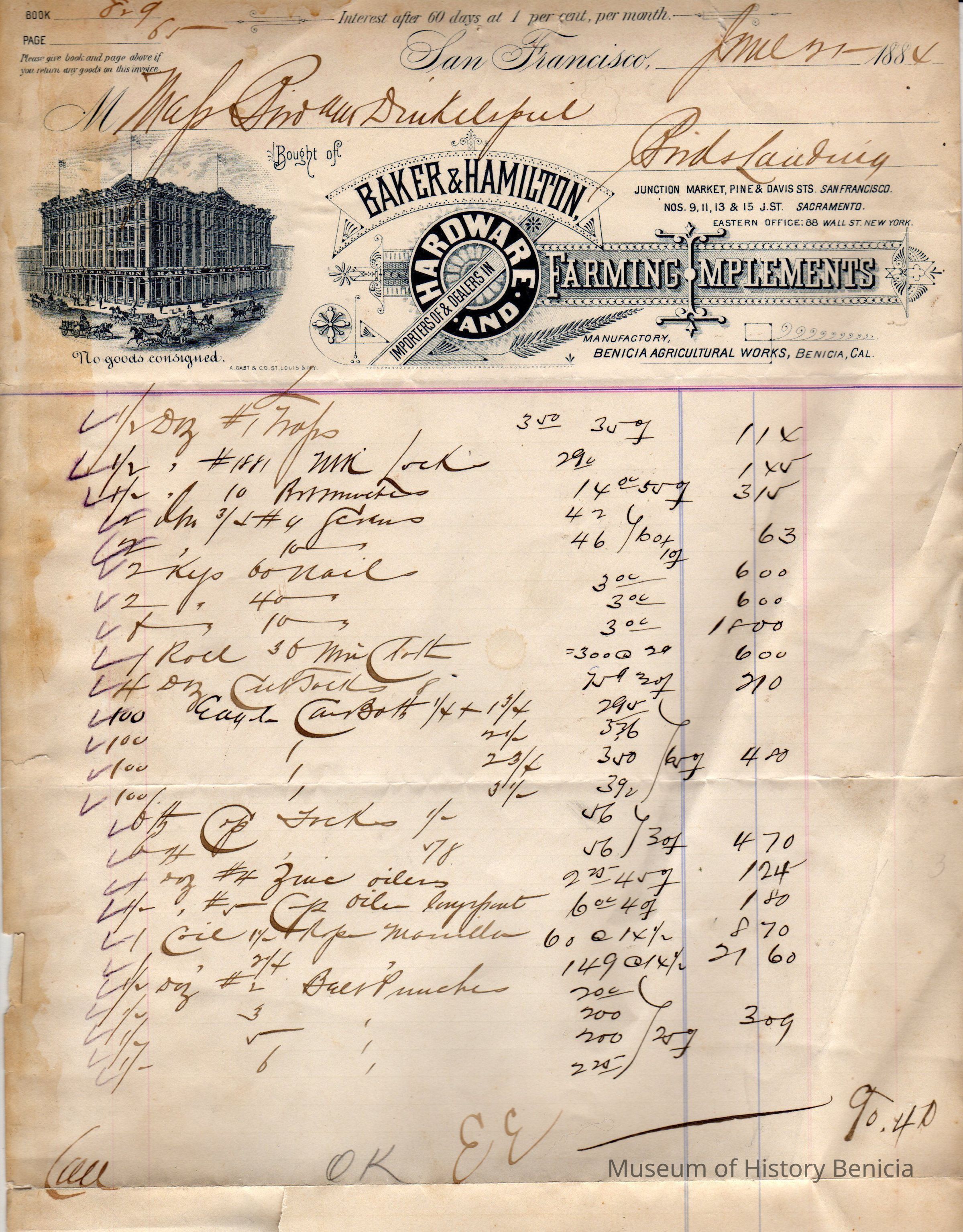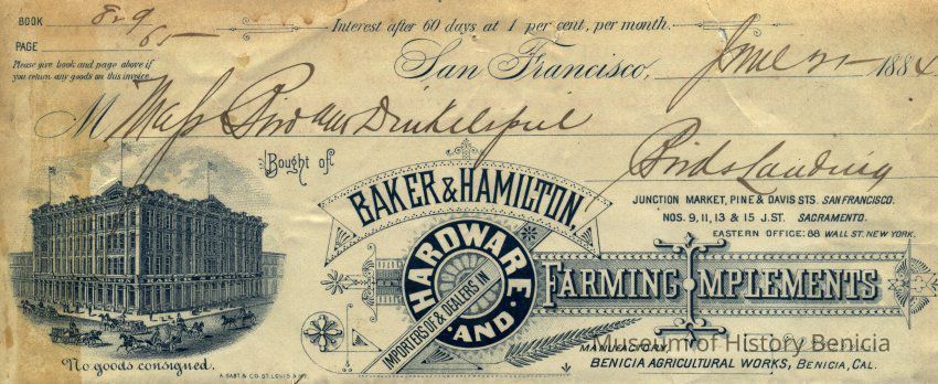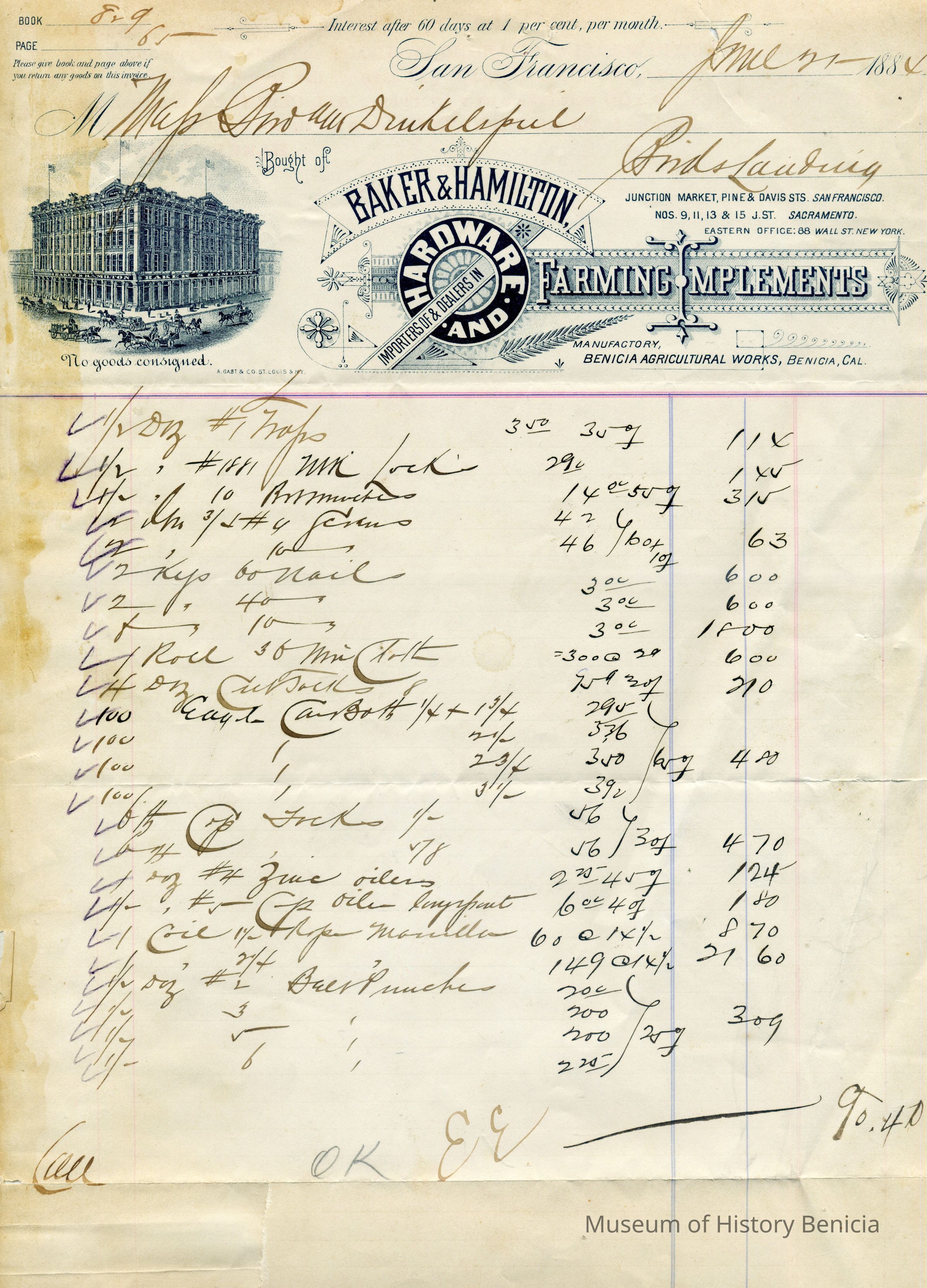 Baker and Hamilton purchase order dated June 21, 1884 with a list of items purchased, quantity, and prices. The order has printed on it Manufactory, Benicia Agricultural Works, Benicia, Cal.Collection