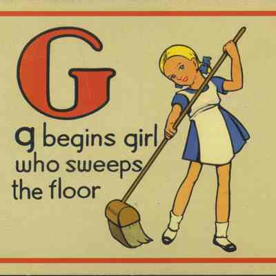 Large G - "g begins girl who sweeps the floor" with a picture of a girl with a broom