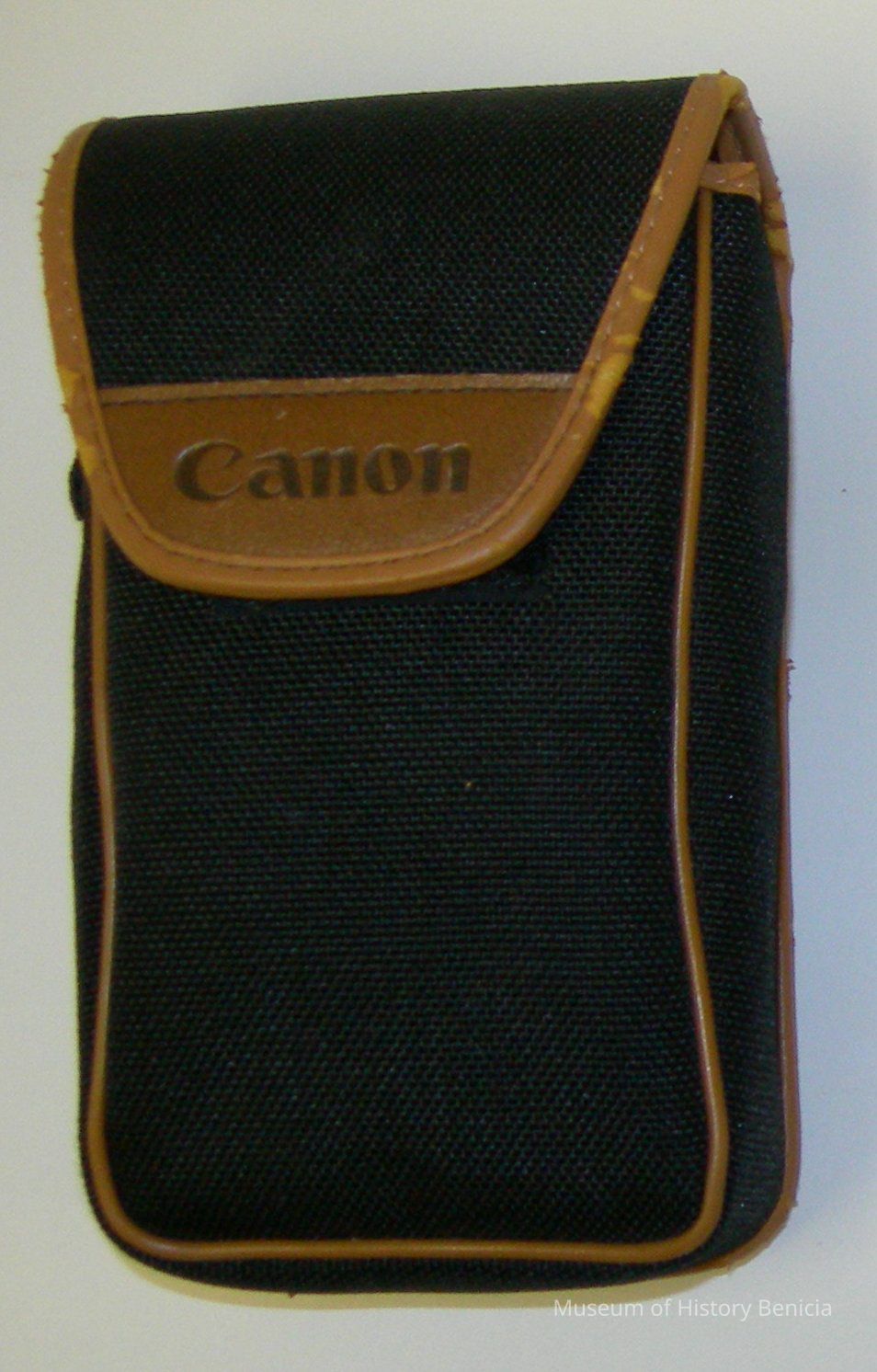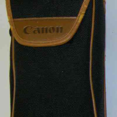 carrying case for Canon "Sure Shot" camera, black cloth with vinyl tan trim, velcro closure, loop on back to attach to belt