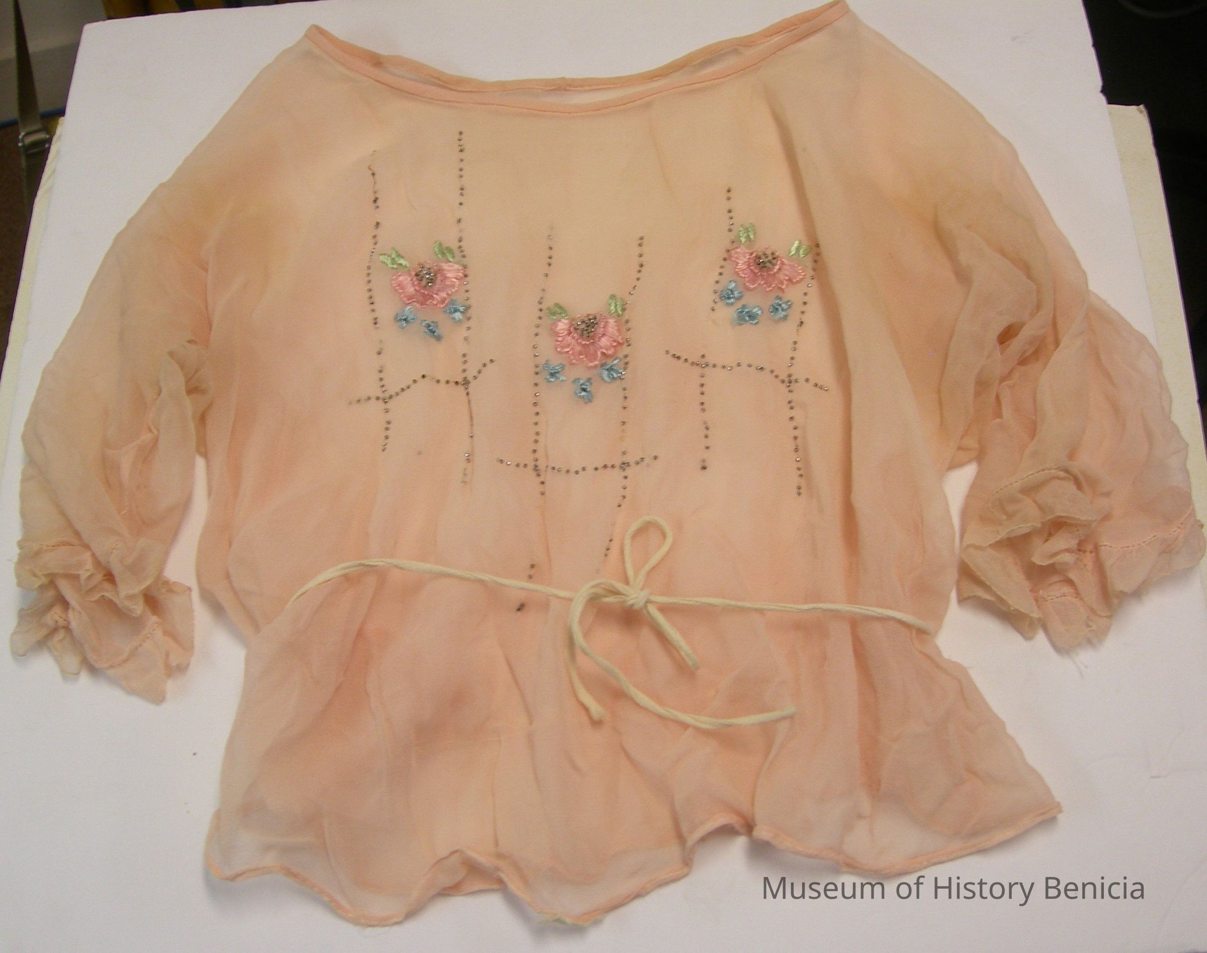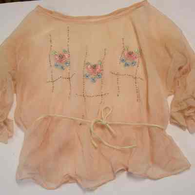 1920's Blouse - pink, sheer crepe-like fabric, with embroidery (thread and small silver beads); ties at the waist.