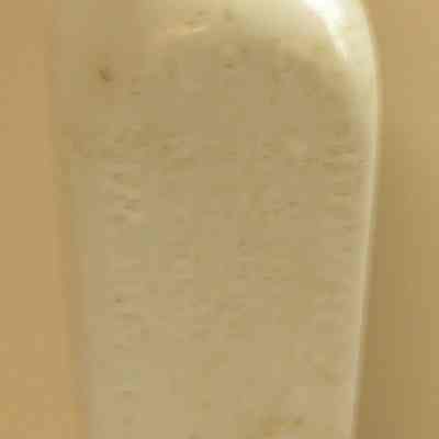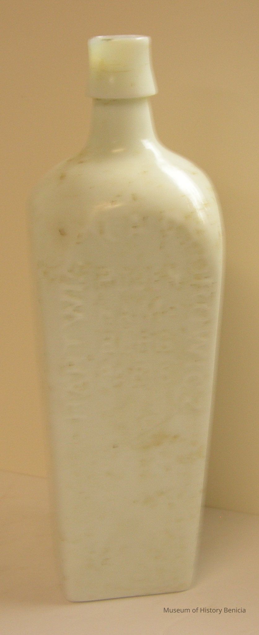 White glass, non-transparent bottle; squarish shaped, bitters bottle;
