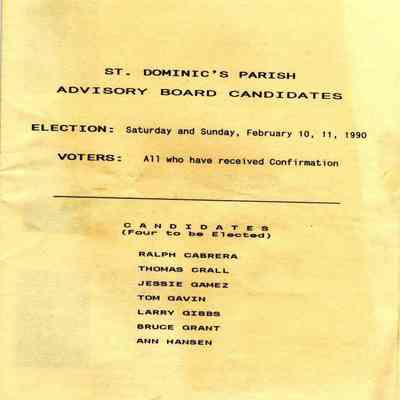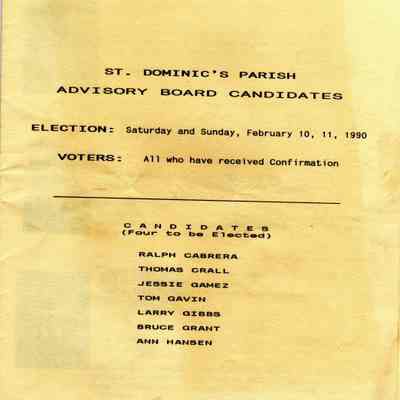 Pamphlet on St Dominic's Parish Advisory Board Canidates 1990.