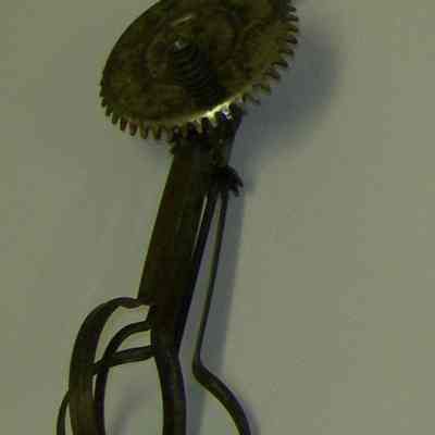 all metal beater/mixer, round geared wheel with handle on side; loop handle on top; usual rounded mixing rotators