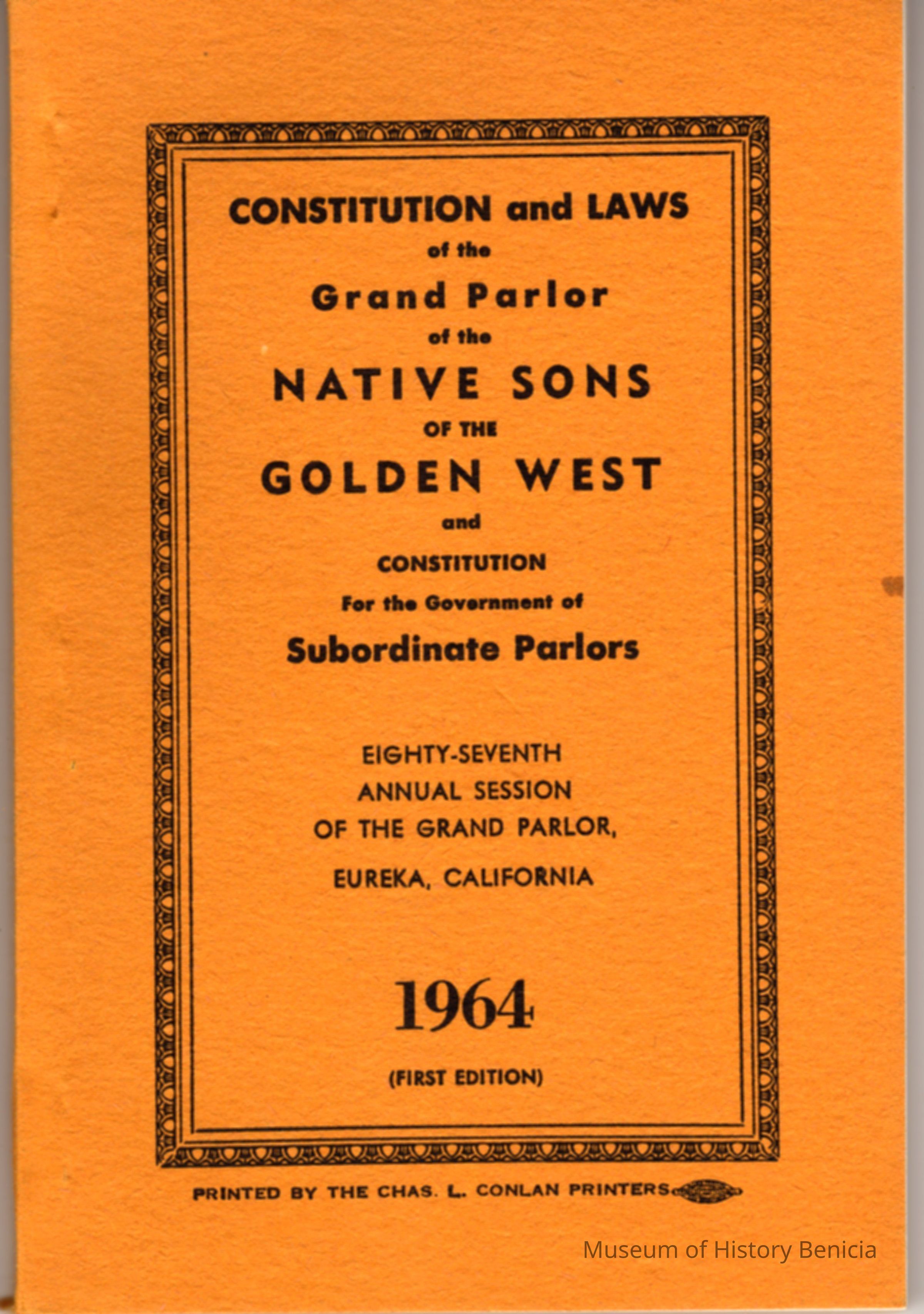 Booklett on Constitution and bylaws of the Native Sons of the Golden West 1964.