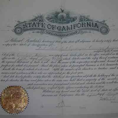 Certificate From the State of California, Department of State: "William C. Hendricks, Secretary of State of the State of California, do hereby certify that a copy of the Articles of Incorporation of the First Methodist Episcopal Church of Benicia certified by the County Clerk of the County of Solano as a copy of such Articles filed in his office, was filed in the office on the 17th day of May AD 1889, which Articles and the copy there of contained the required Statement of Facts, to wit, First, the name of the corporation as aforesaid; Second, the purpose for which it is framed; Third, the place where its principal business is to be transacted; Fourth, the term for which it is to exist; Fifth, the number of its directors or trustees, and the names and residences of those who are appointed for the first year. And I do hereby further certify that the Articles of Incorporation set forth the holding of the election for directors, the time and place where the same was held that a majority of the members of such association were present and voted at such election and the result thereof; which facts were verified by the offiders conducting the election. Witness my hand and the Great Seal of State at office in Sacramento, California, this the 17th day of May AD 1889." Signed by Mr. Hendricks as secretary of state and his deputy, a Mr. Davidson. on parchment, 21-1/2" x 16-1/2"