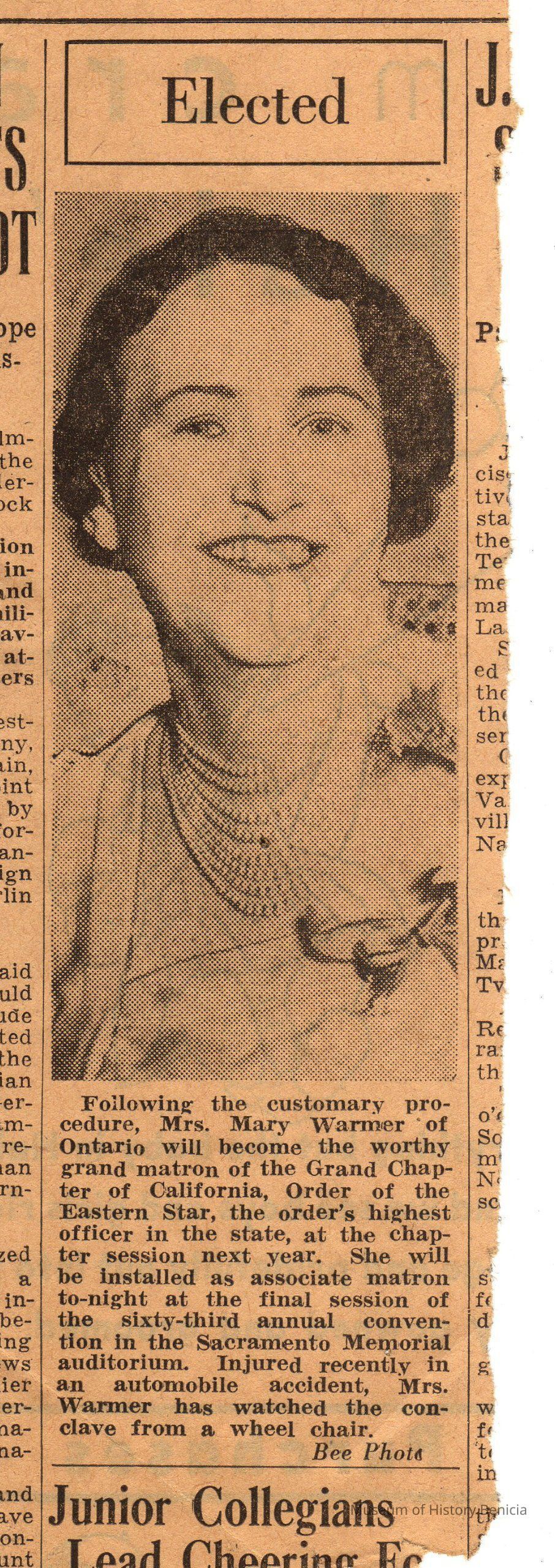 Newspaper clipping/photograph from the "Sacramento Bee" about an Eastern Star Officer Mrs. Mary Warmer