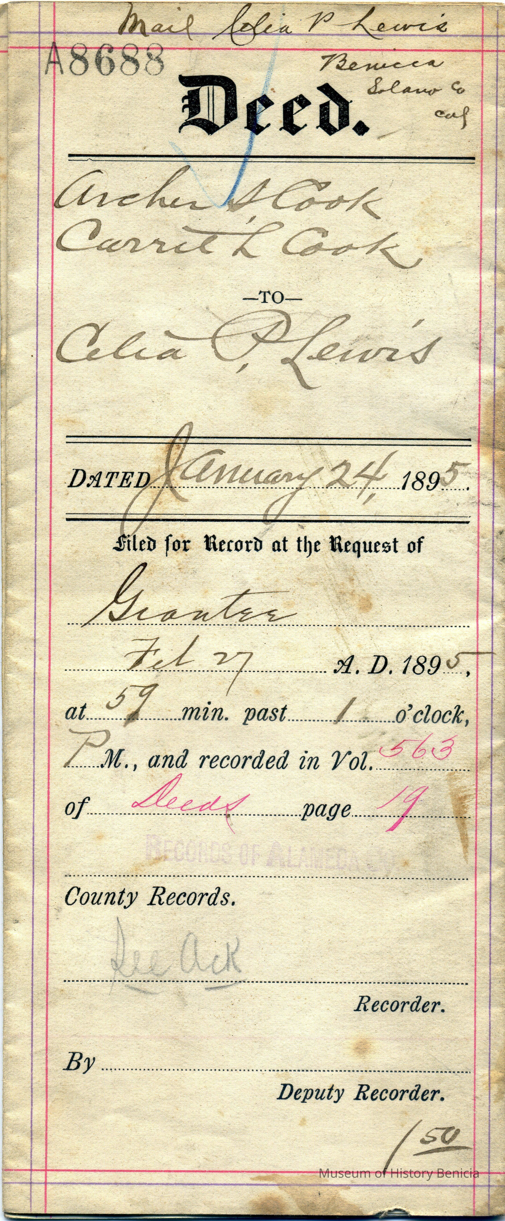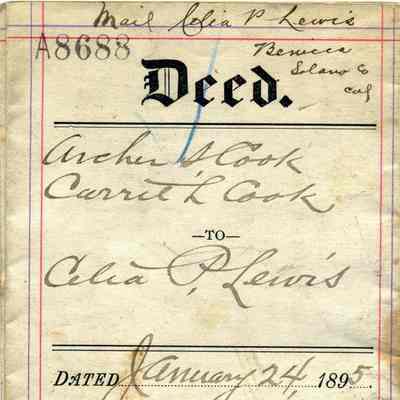 This is a Deed of Trust for the transfer of property from Archer and Christine and Carrie Cook to Celia P Lewis on 01/24/1895. The price was $10.00 for a piece of property in Berkeley, CA.