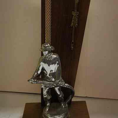 Trophy with wood base and back-drop with gold metal adornment and silver firefighter and plate