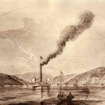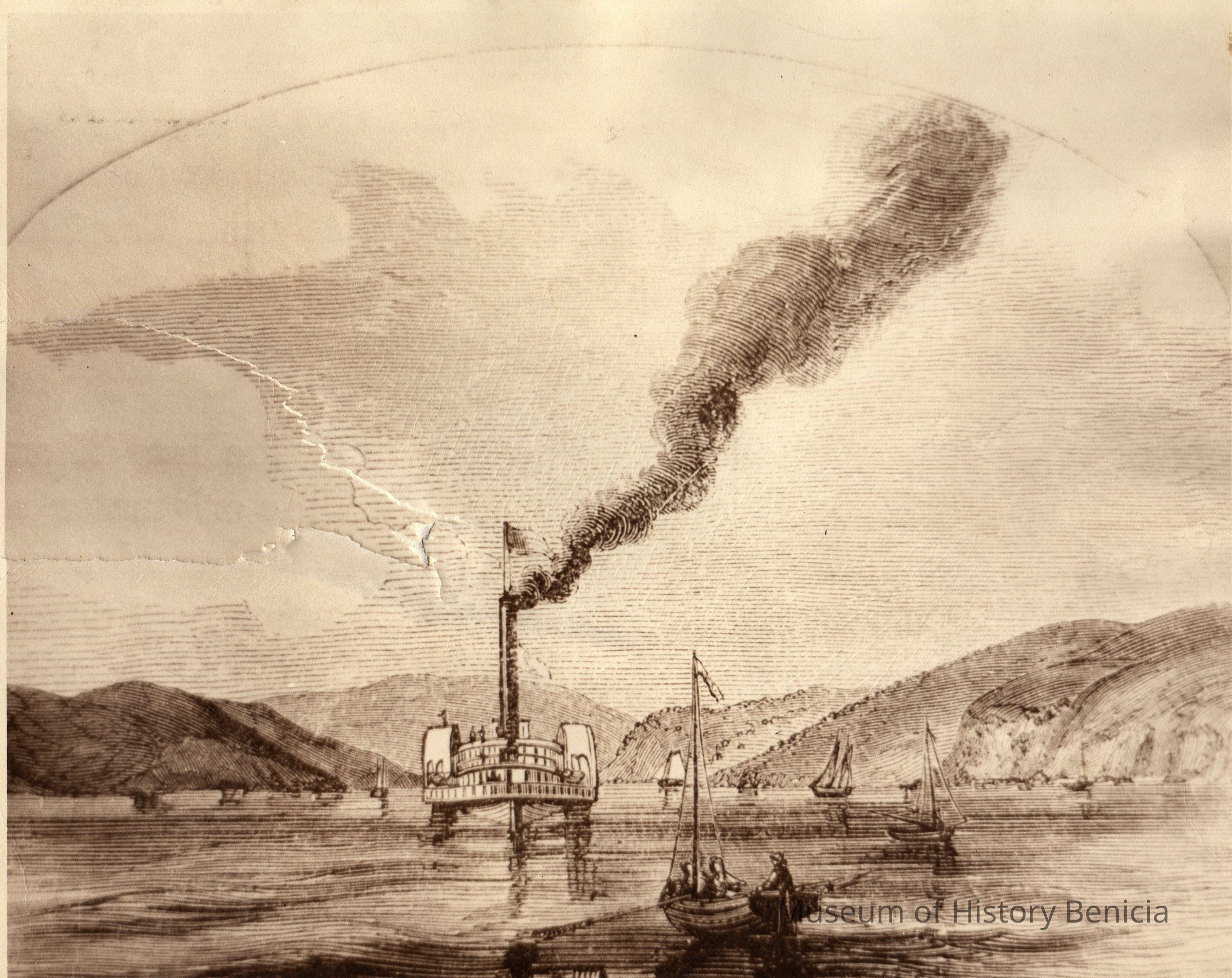 Copy of a drawing/lithodgraph: Steamer heading toward Benicia after coming through Carquinez Strait. Copy from a book entitled "Scenes of Wonder and Curiosity in California: A Tourist's Guide to Yosemite Valley" by J.M. Hutchings, published in 1870.Collection