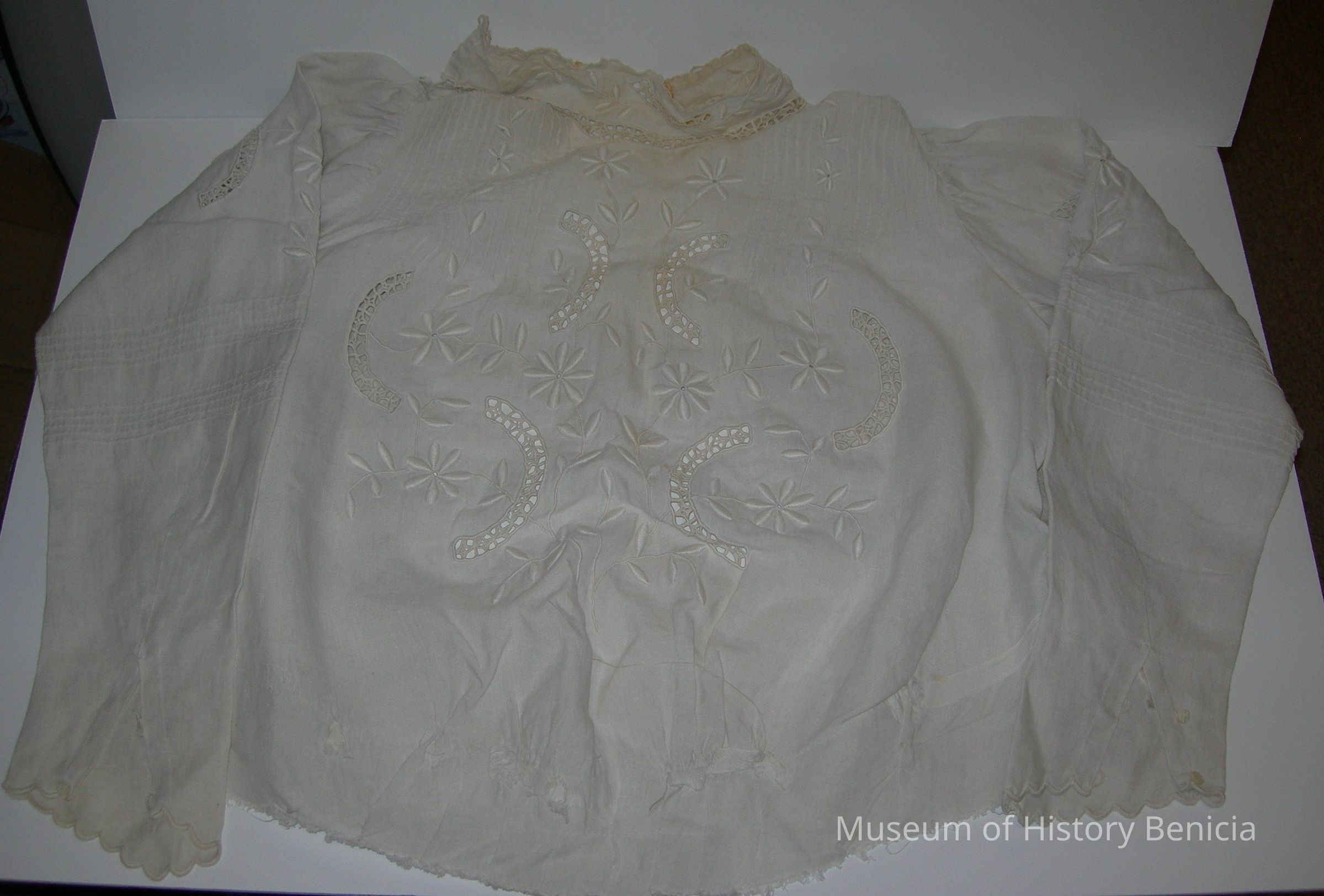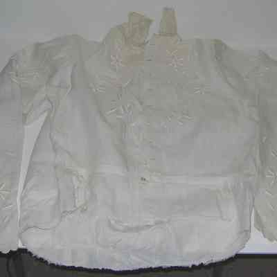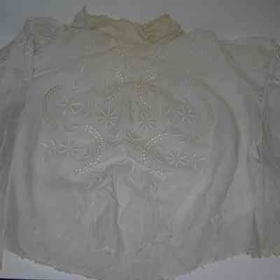 Part of a four piece beige ensemble: linen-type fabric, heavy embroidery with open work made in Florence Italy (see provenance) blouse: 24" sleeves with gathers at top of set in scalloped sleeve edge; 10 pearl type buttons, gathered waist with hook/eye unfinished hem, to be tucked into skirt