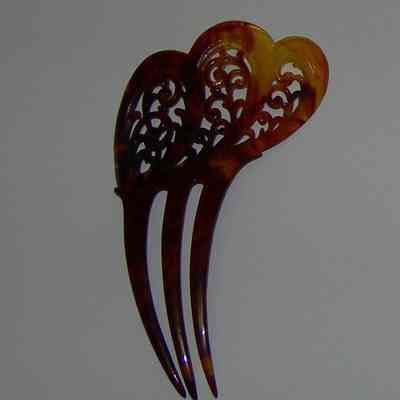 decorative comb to be worn with elaborate hair dos; three pointed tines, three flourishes with open work, brown plastic - could be tortoise shell
