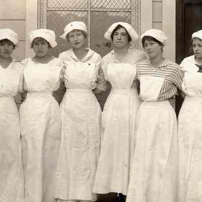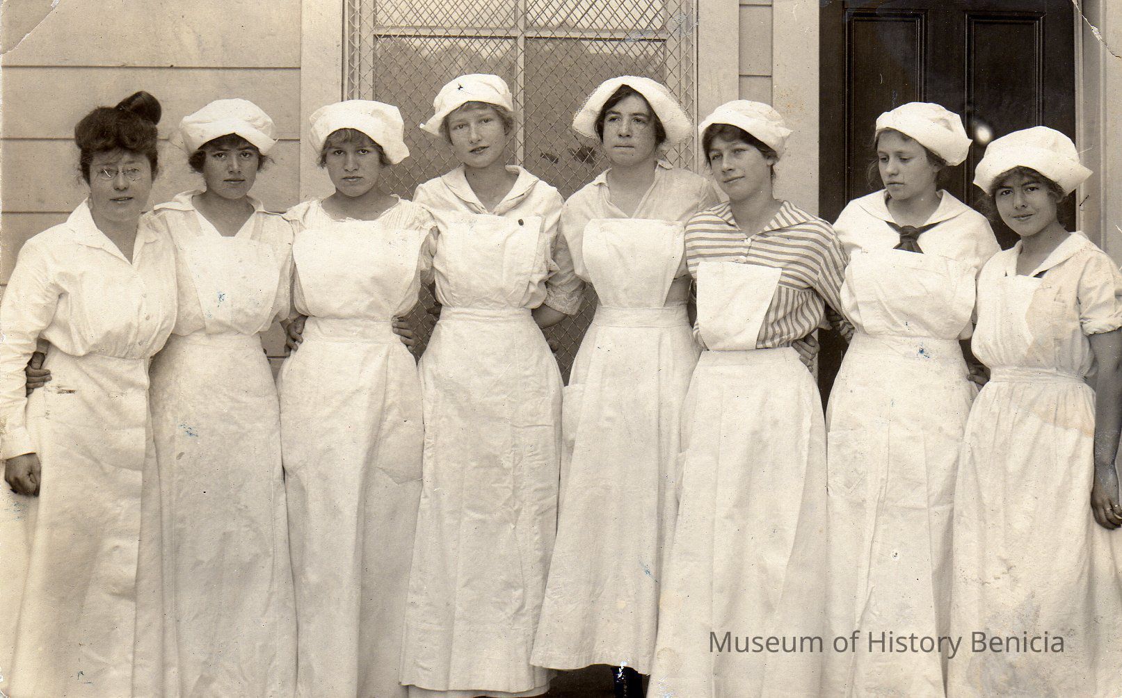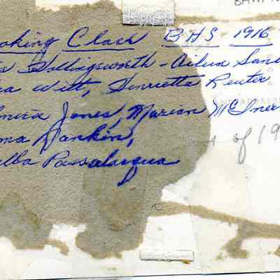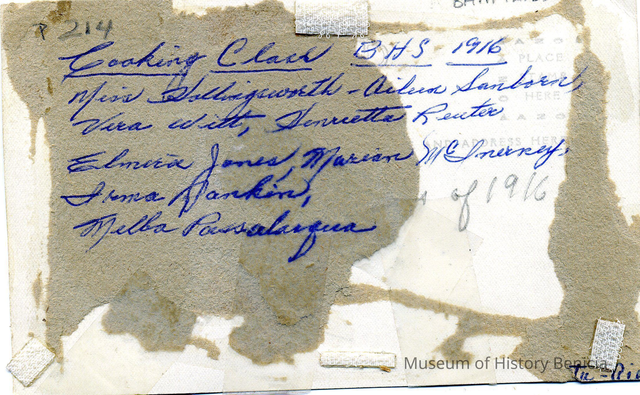 B/W photo of cooking class at Benicia High School, 1916. L/R: Miss Hollingsworth (teacher), Aileen Sanborn, Vera Witt, Henrietta Reuter, Elmira Jones, Marian McInerney, Irma Rankin, Melba Passalacqua. copy by Tom Hosley is 8" x 10".