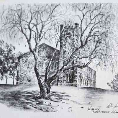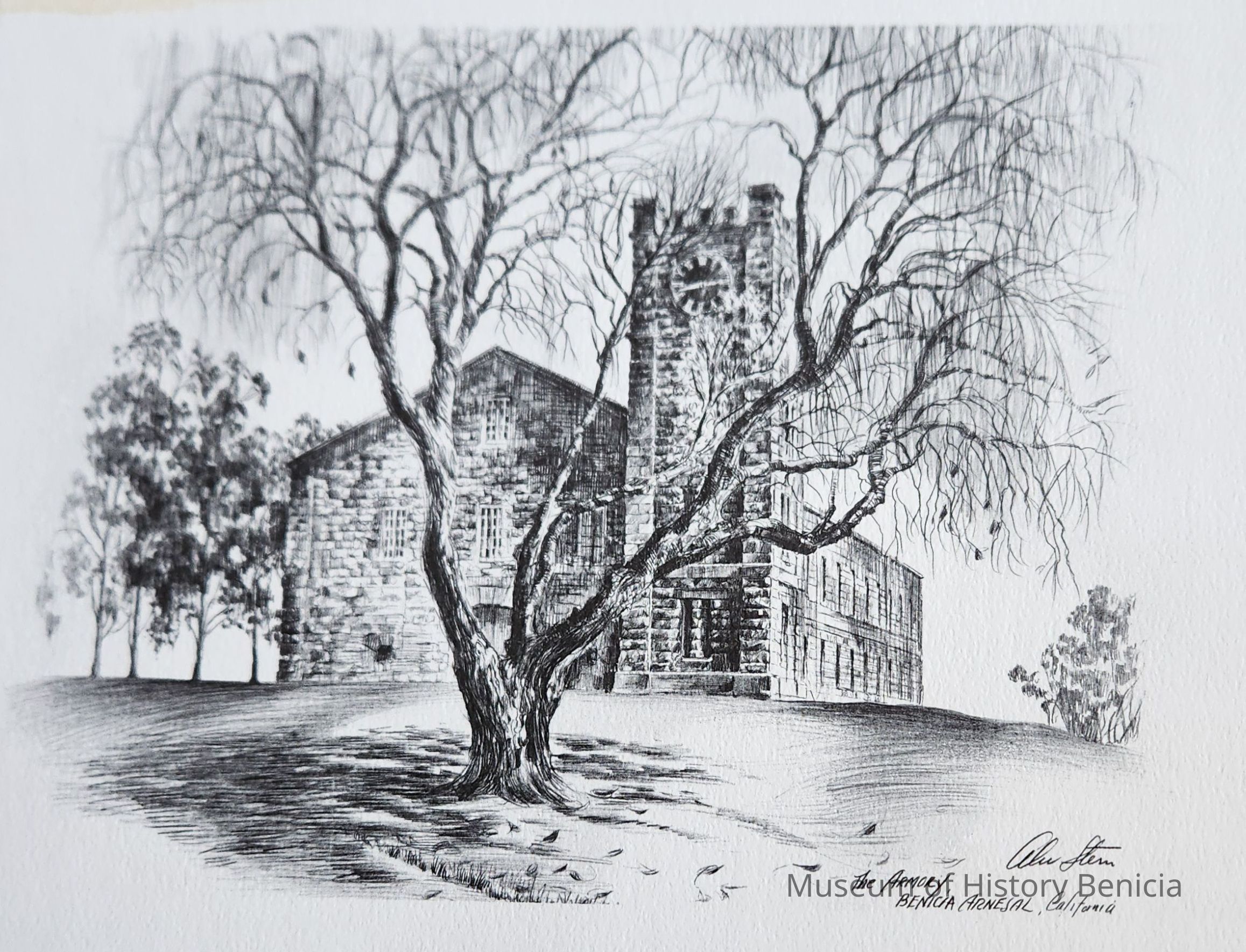 Copy of a drawing: black on white by Alex Stern "The Armory, Benicia Arsenal, California" The Clocktower behind a tree.