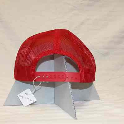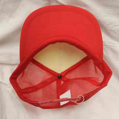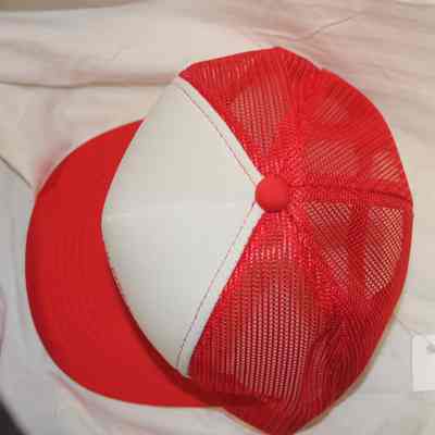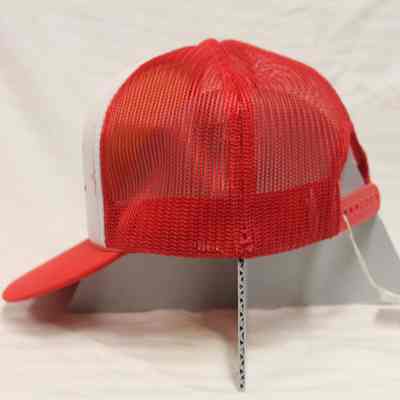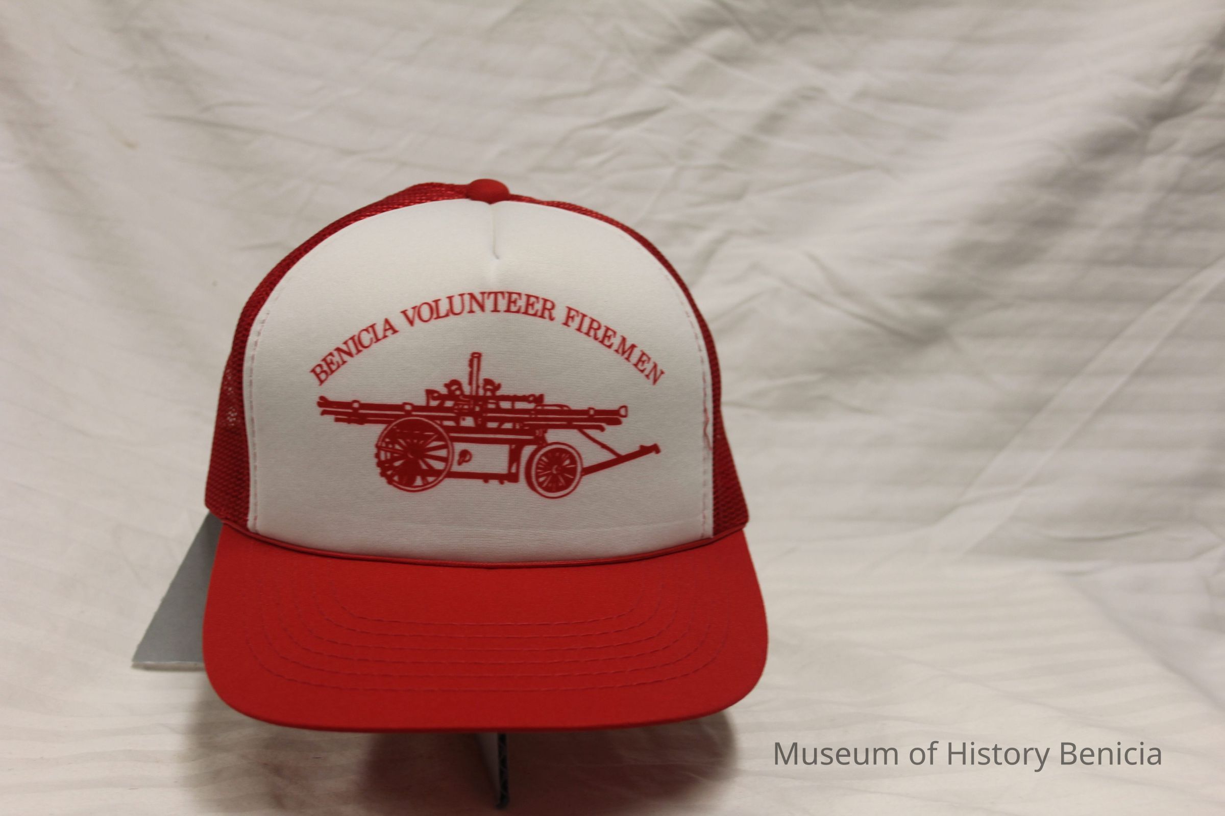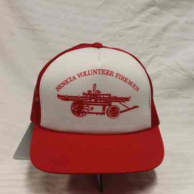 Red and White Nylon and Plastic Trucker style baseball cap with imprint image of fire hand pump truck. - White front with Benicia Volunteer Firemen imprint. Red mesh back of cap. Brand is "YR Headwear". Made in Korea. One size fits all. (Appears same as 2022.6.12.21.1)