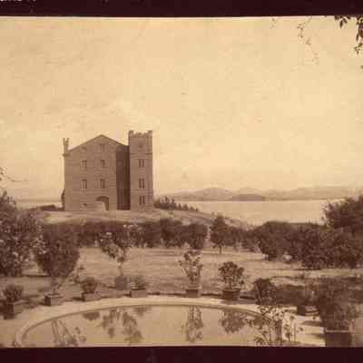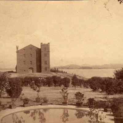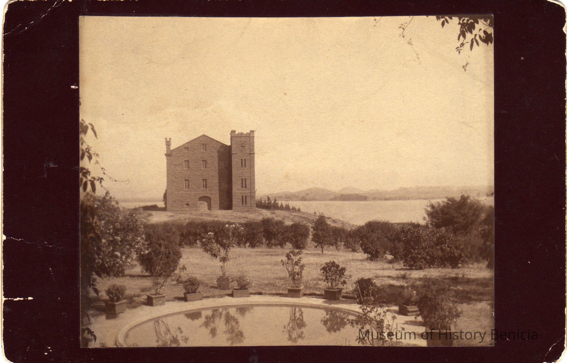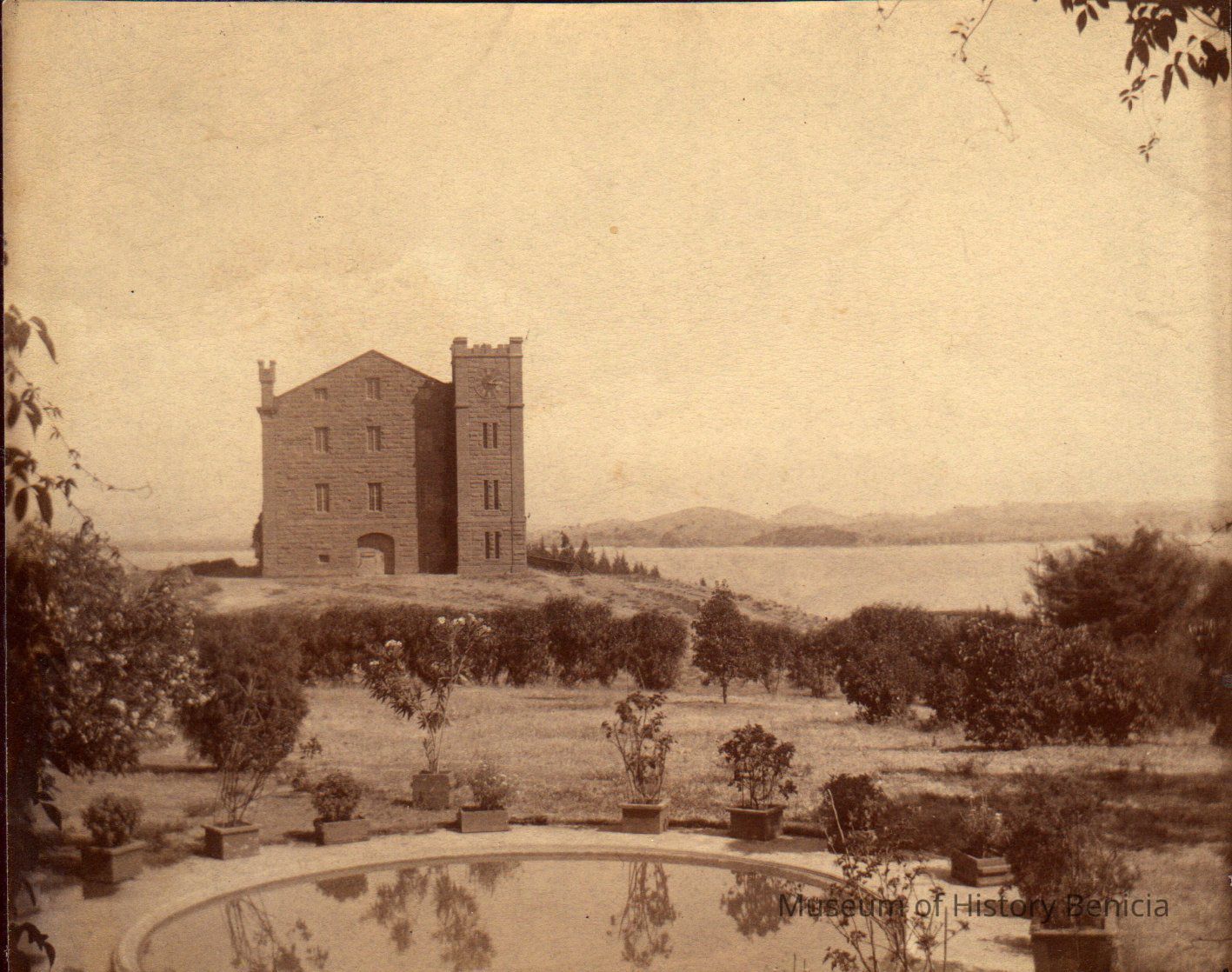 B/W photograph: Benicia Arsenal Clock Tower with three stories taken from the Commandant's house. Back of photo reads: