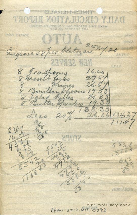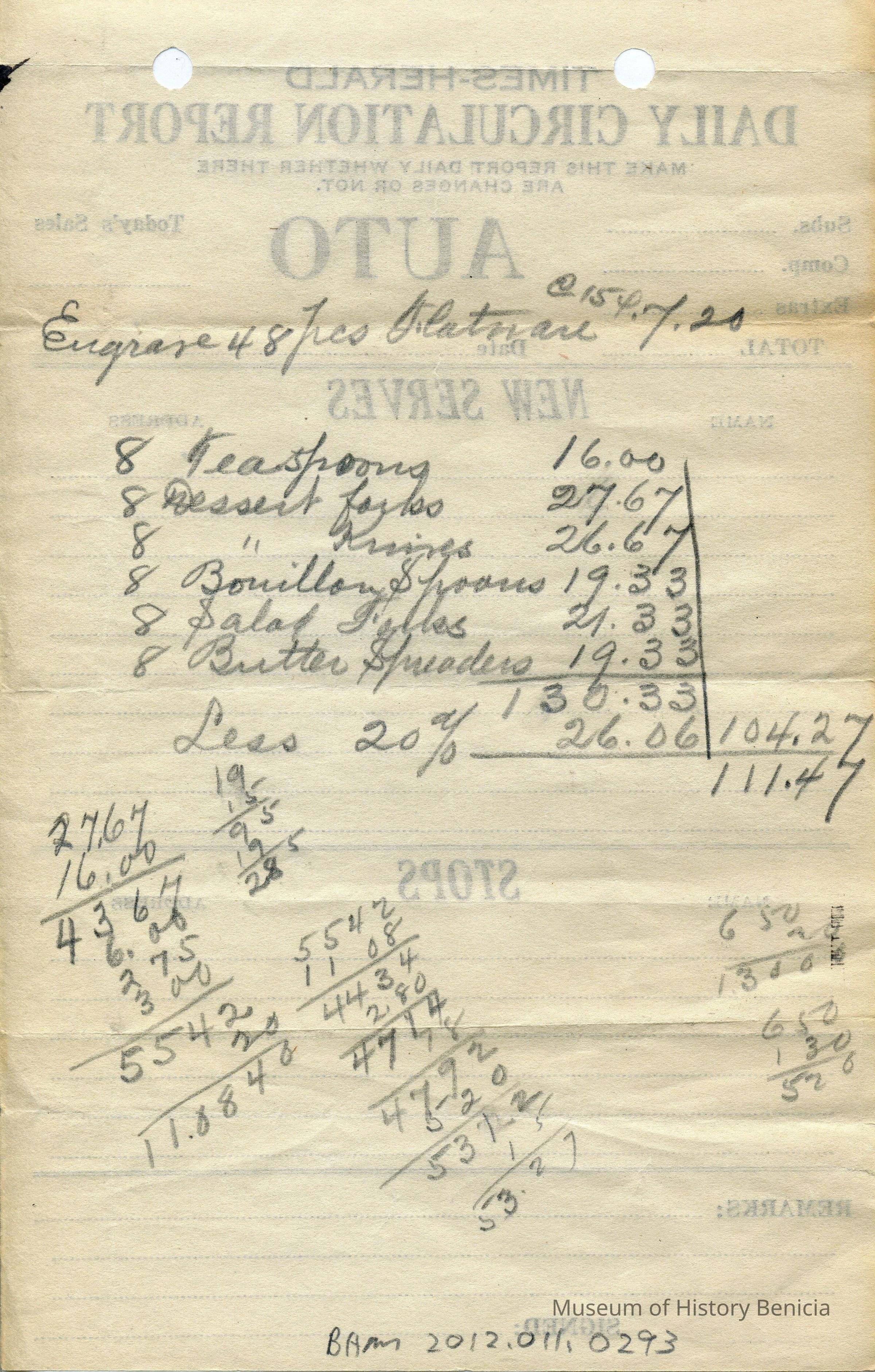 Times-Herald Daily Circulation Report blank. This was used as scratch paper to add up pieces of silverware and their cost.