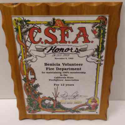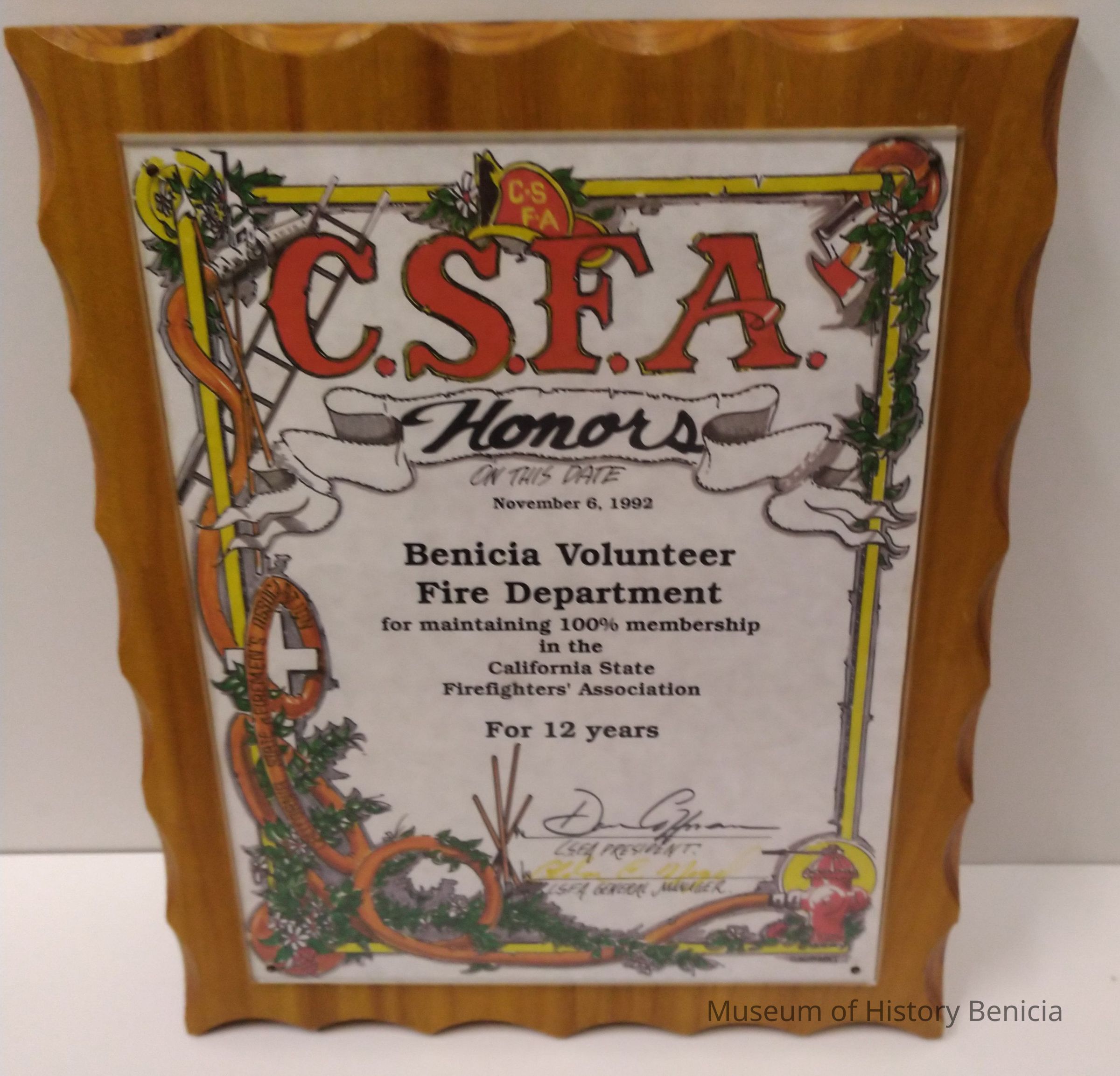 C.S.F.A. Honors on this date November 6, 1992 Benicia Volunteer Fire Department for maintaining 100% membership in the California State Firefighters Association for 12 yearsCollection