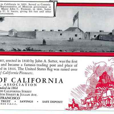 White card with black printing and photos, along with a drawing of a covered wagon and borders and "Sutter's Fort" in red