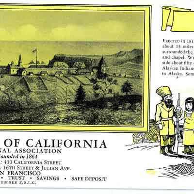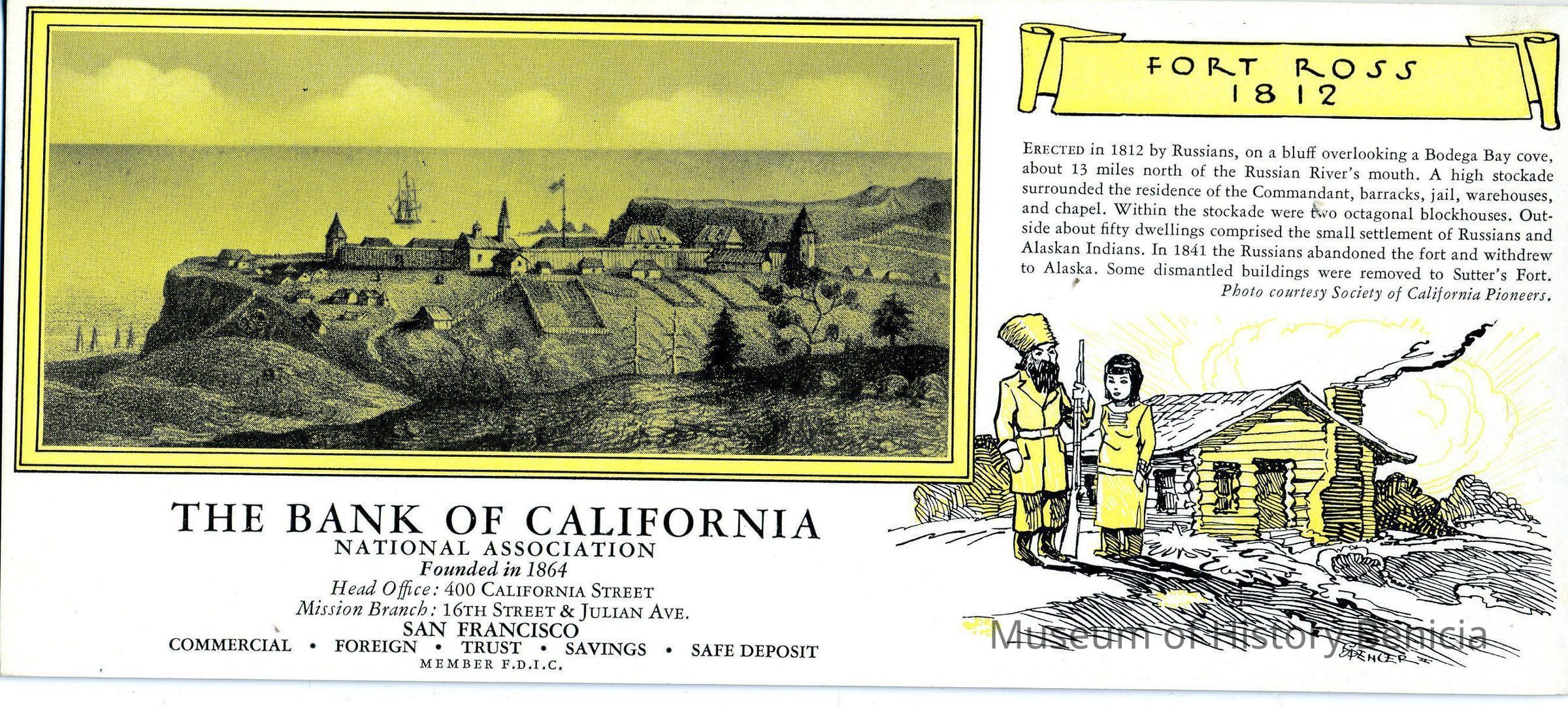 Blotter from The Bank of California, National Association, Founded in 1864, San Francisco, Calif. White card with black printing, drawing of a cabin and 2 people with yellow accents in the background of the photo, in the drawing and the title banner "Fort Ross 1812" with information about the Fort Photo Courtesy of Society of California Pioneers reverse side blotter is blue, unused size: 3-7/8" length x 8-7/8" width