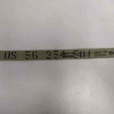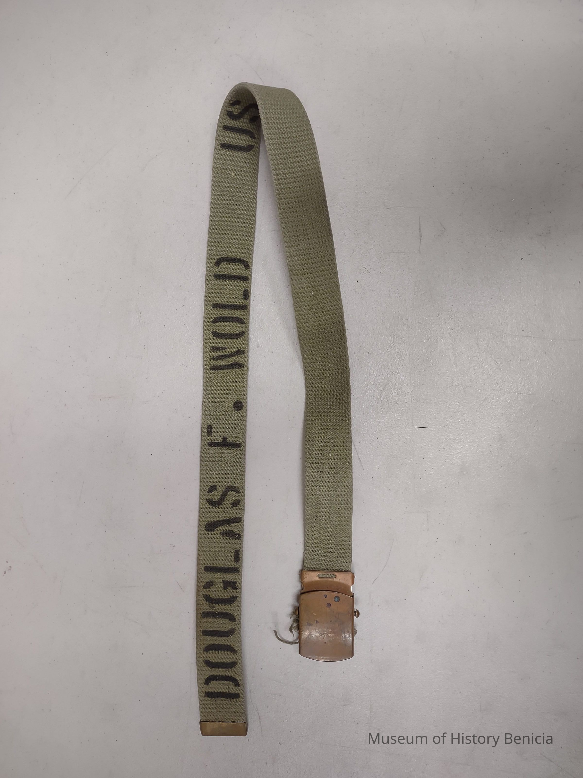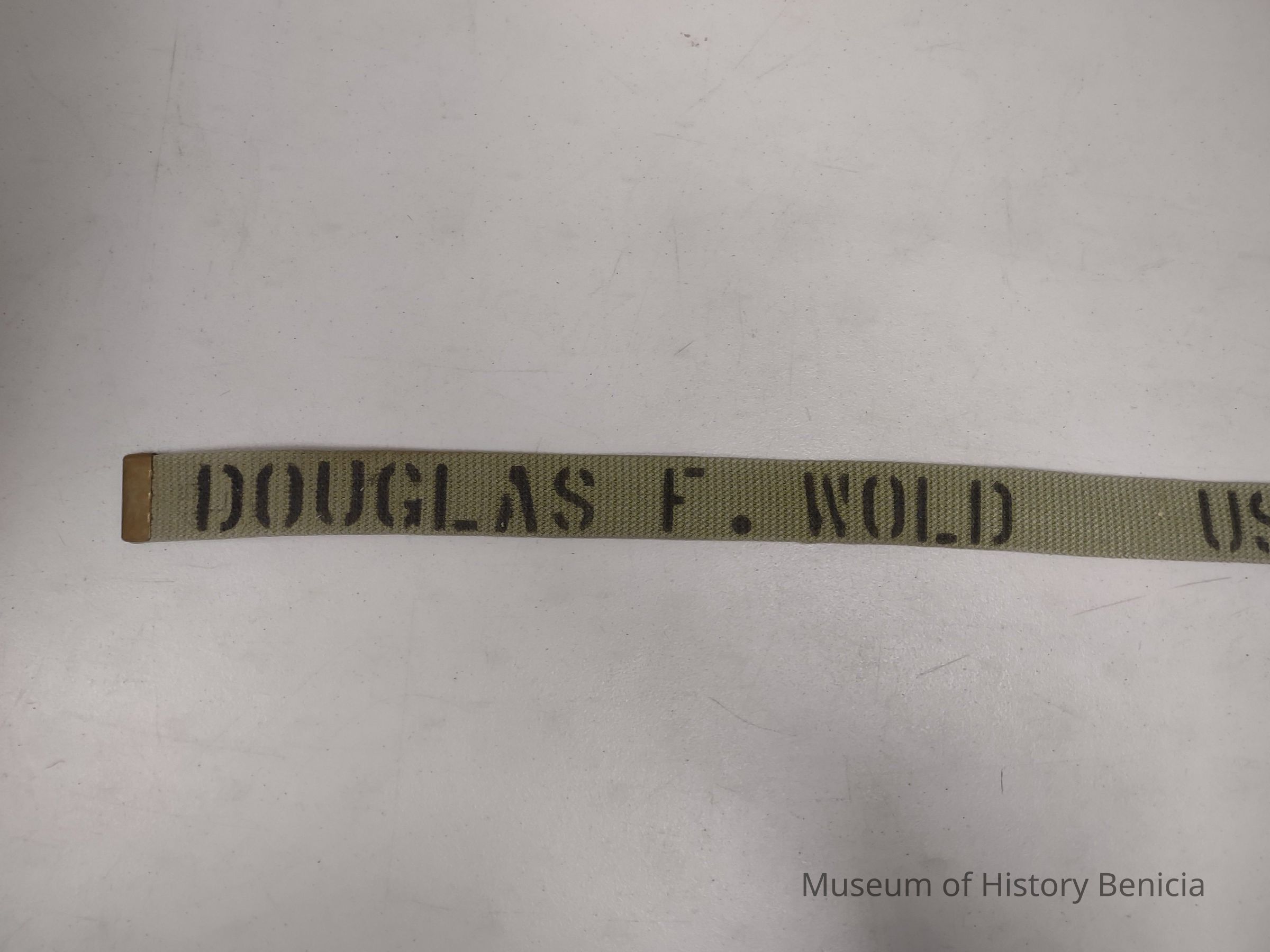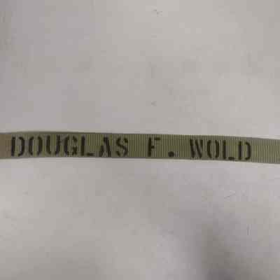 Woven, khaki, military style belt with copper-toned clasp. Labeled with Douglas F. Wold inside belt as well as other information. (duplicate of 3000.23.5.2)