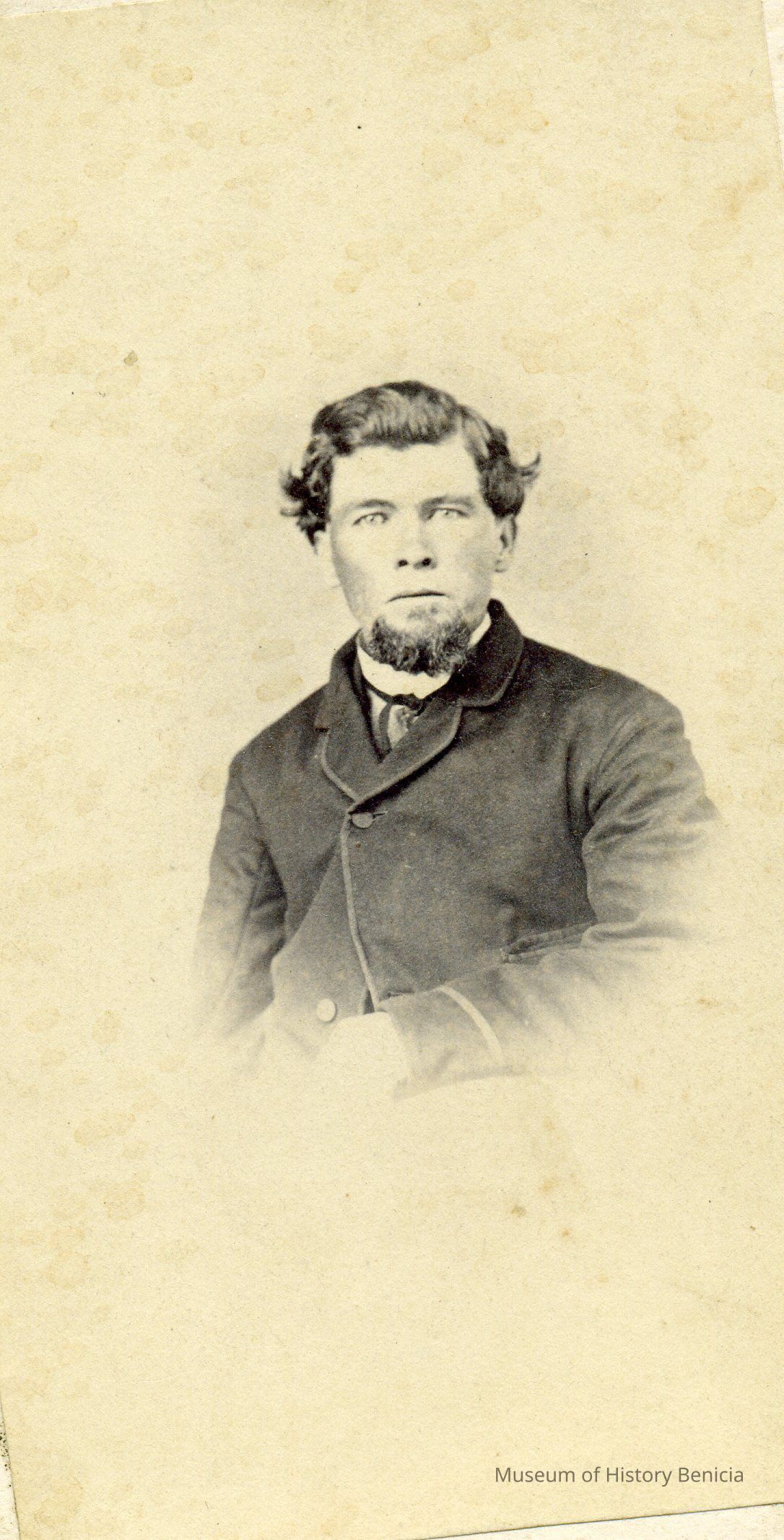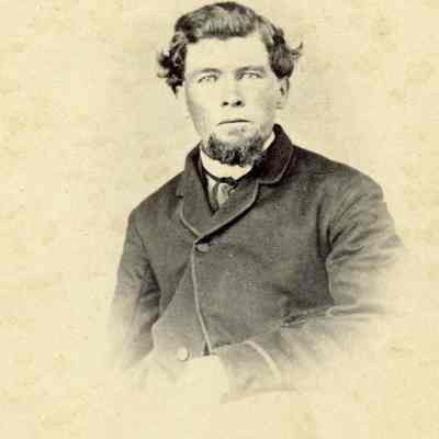 Carte-de-visite of a man with a beard and no mustache. The photo is pasted onto the card at an angle.