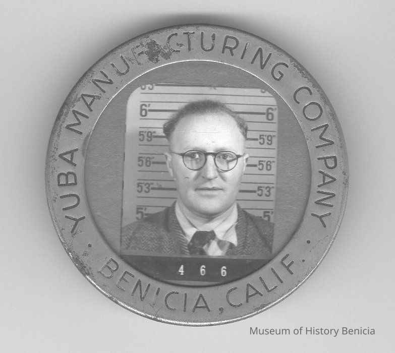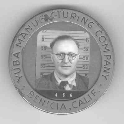 Employee identification badge. Silver metal rim with photo of Ed Prouty, 466, Purchasing Agent for Yuba Manufacturing Co. Prouty worked for Yuba from 1935-1970. Red paper backing. Hinged pin on back.Collection