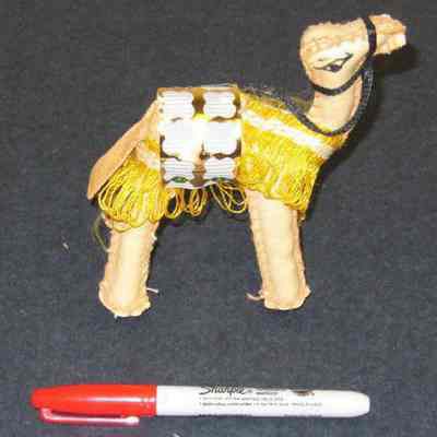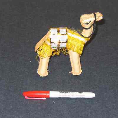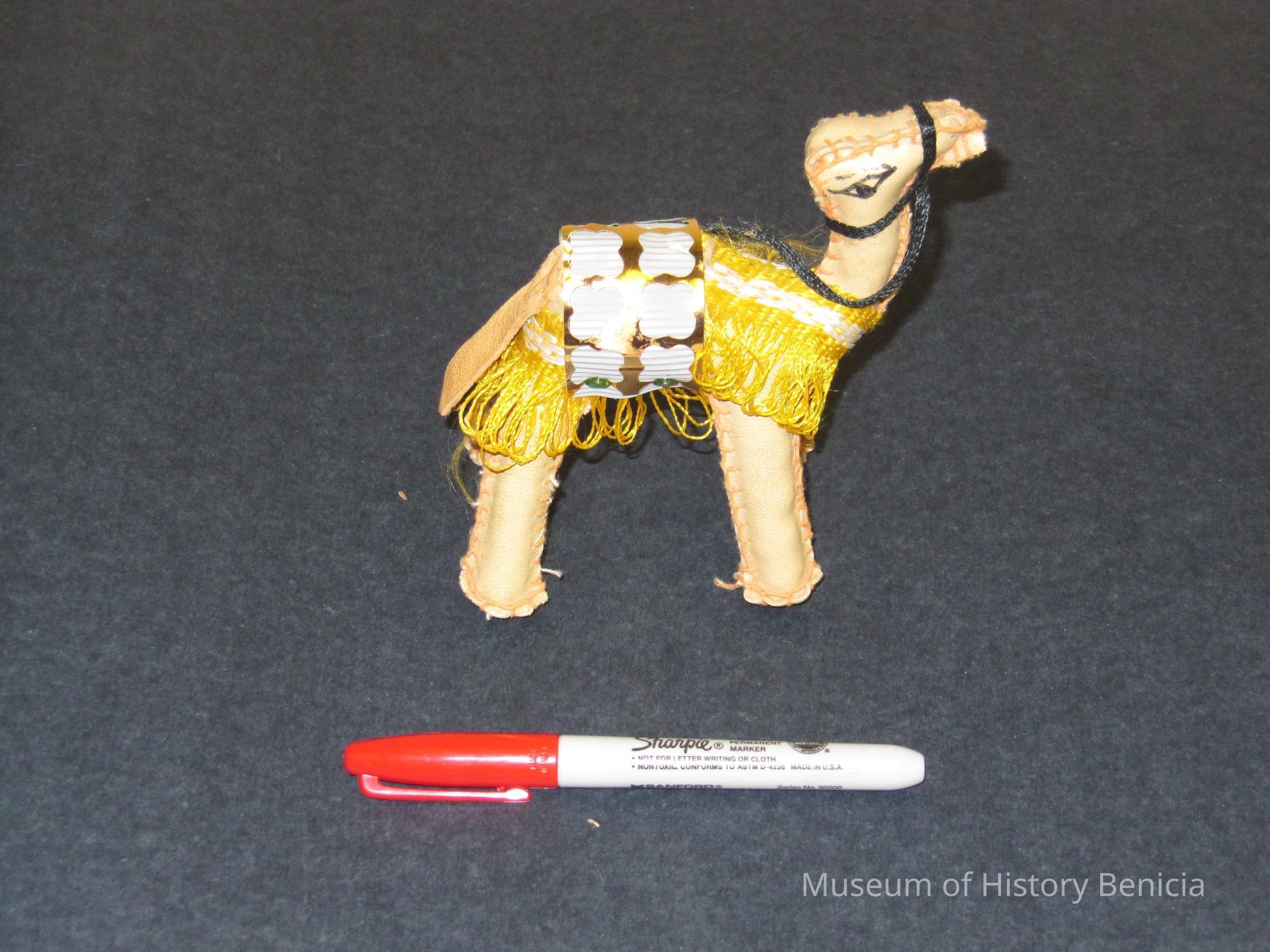 Camel toy made of leather pieces stitched together with pink thread; has yellow "blanket", saddle made of grey plastic, gold paper and green sequins; has black "harness" and leather tail; saddle held together with four nailsCollection