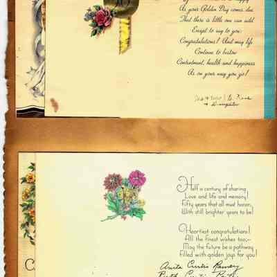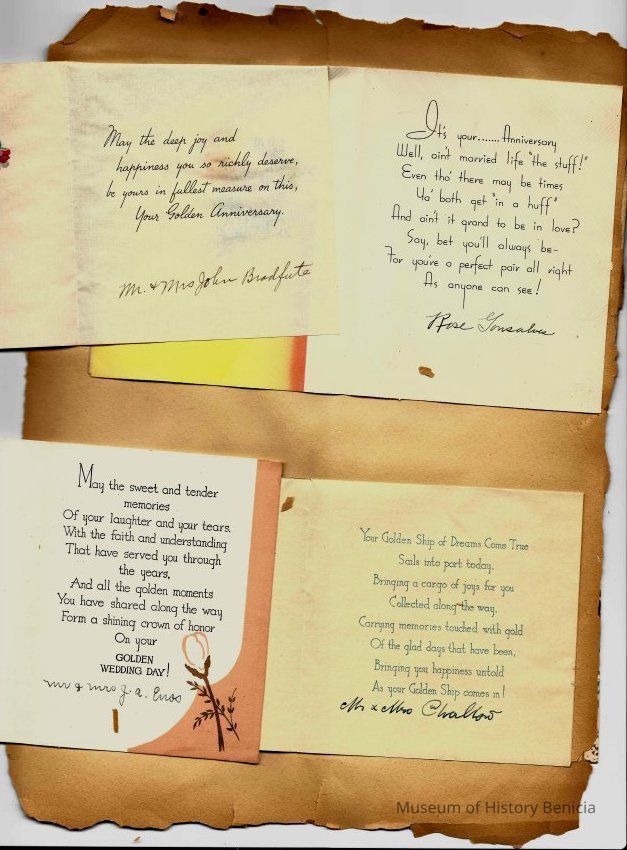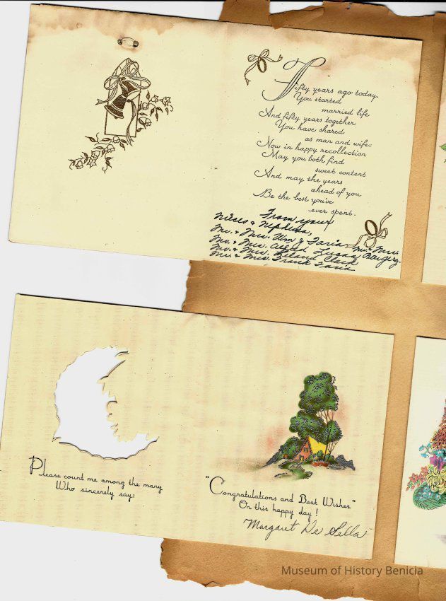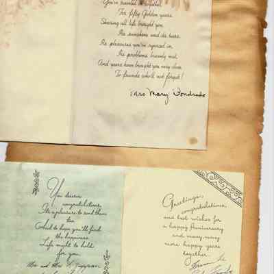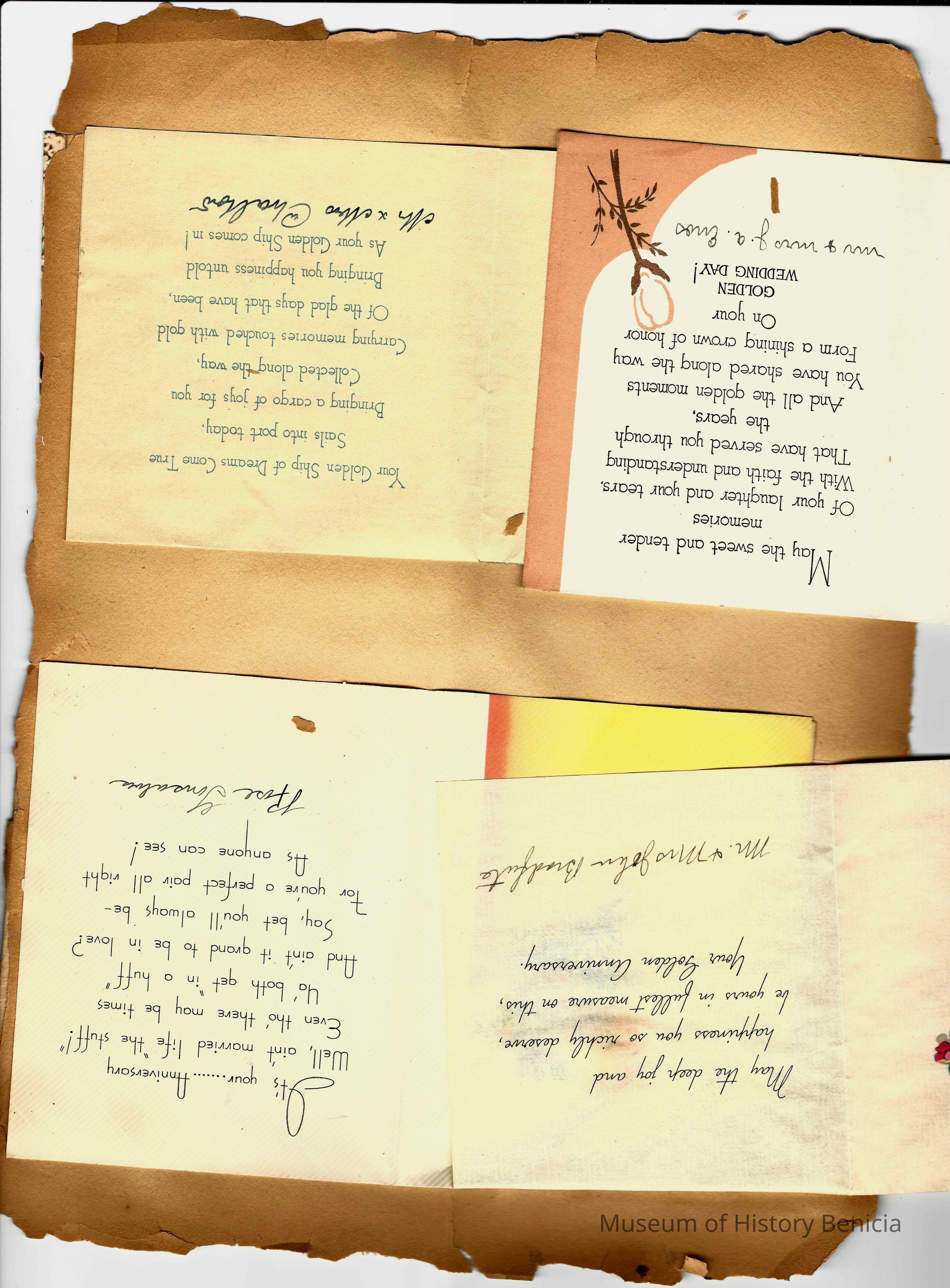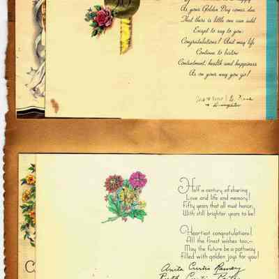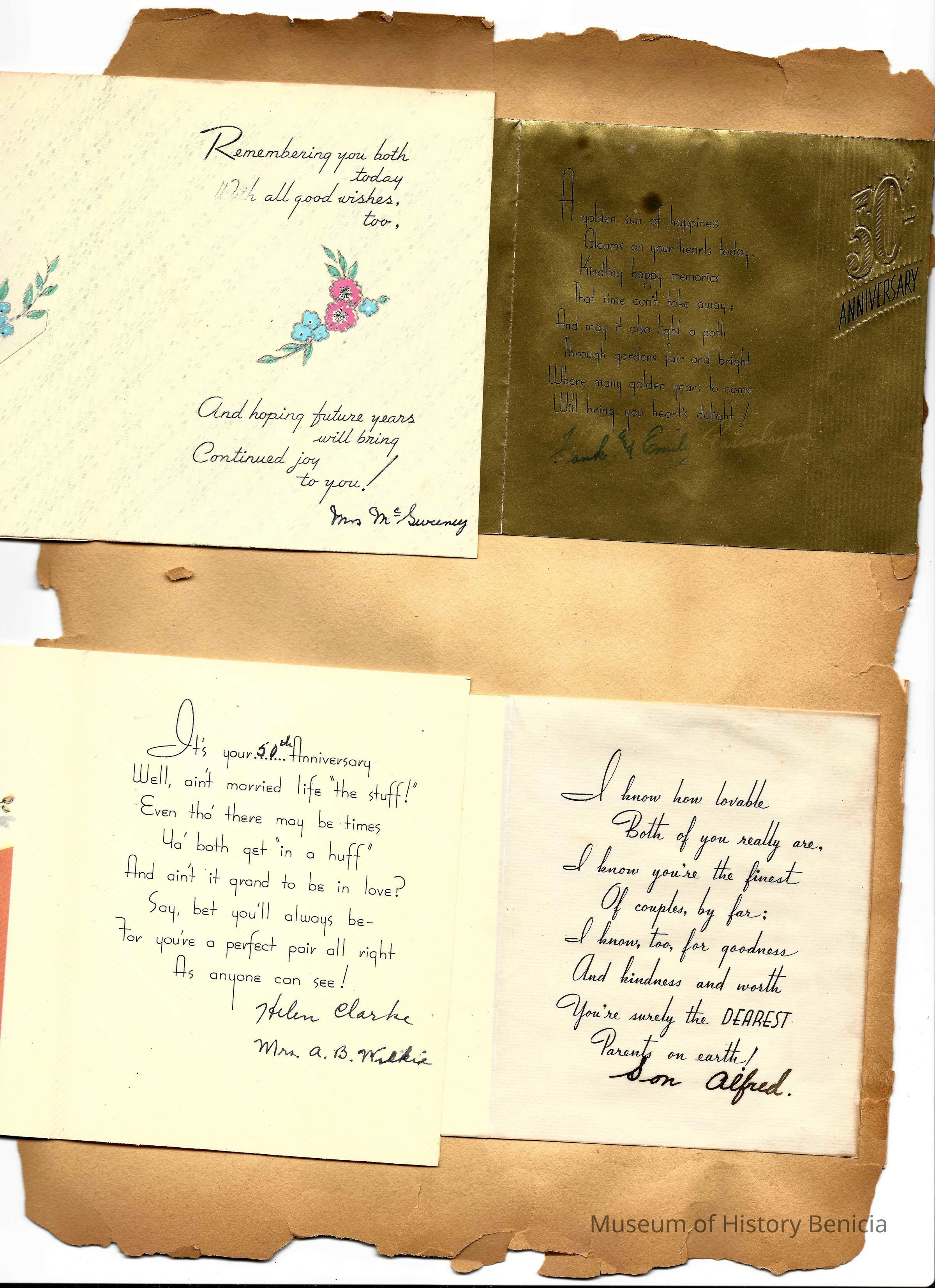 Scrapbook made for the 50th anniversary of Mr & Mrs Joseph DeSilva Sr. The celebration was in 1939 and they were married in 1889. It includes letters, cards, signatures, etc. and an original marriage license for a couple called Silvara.