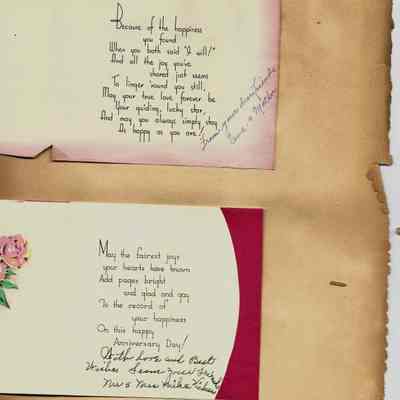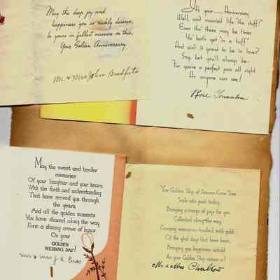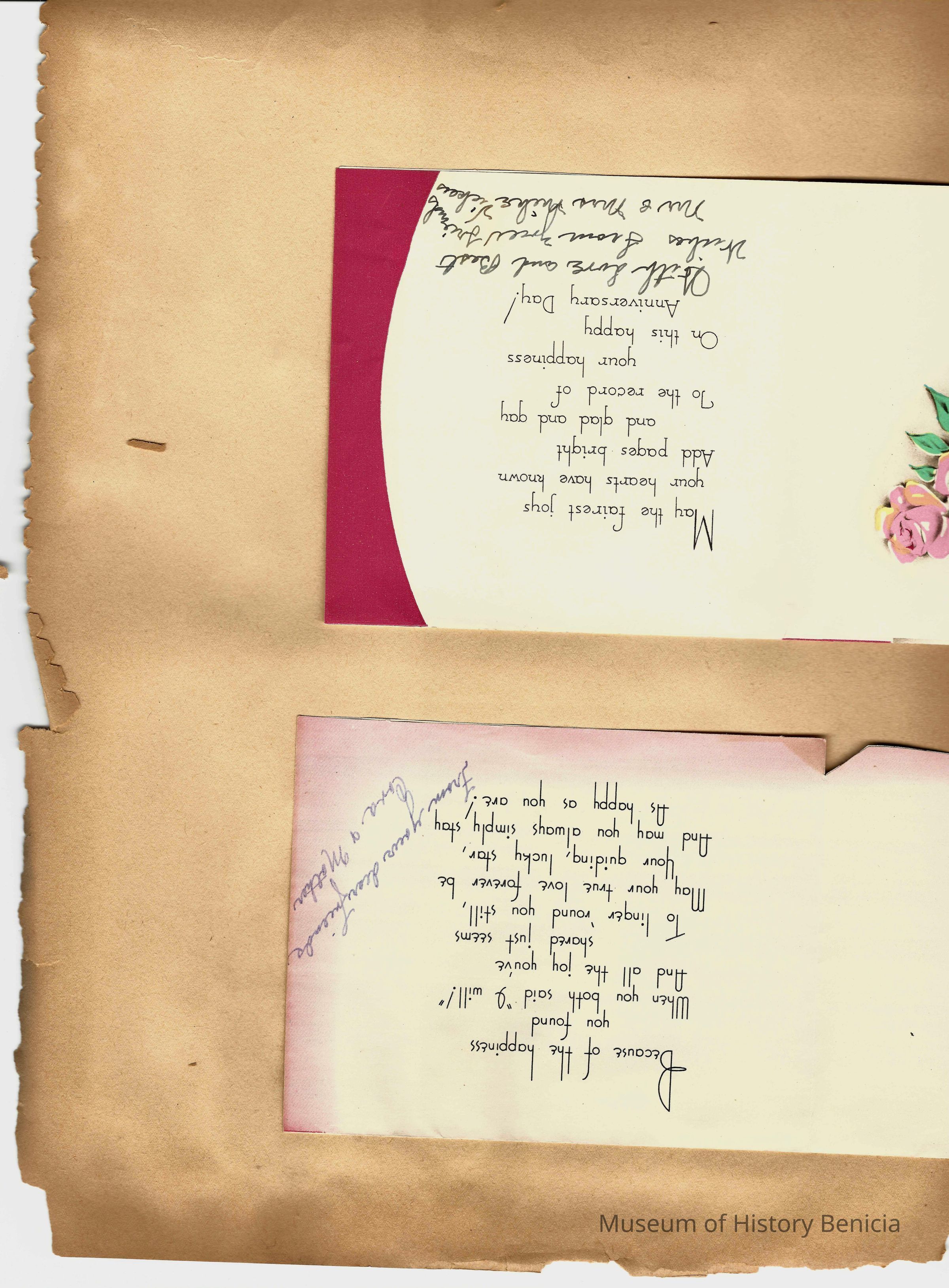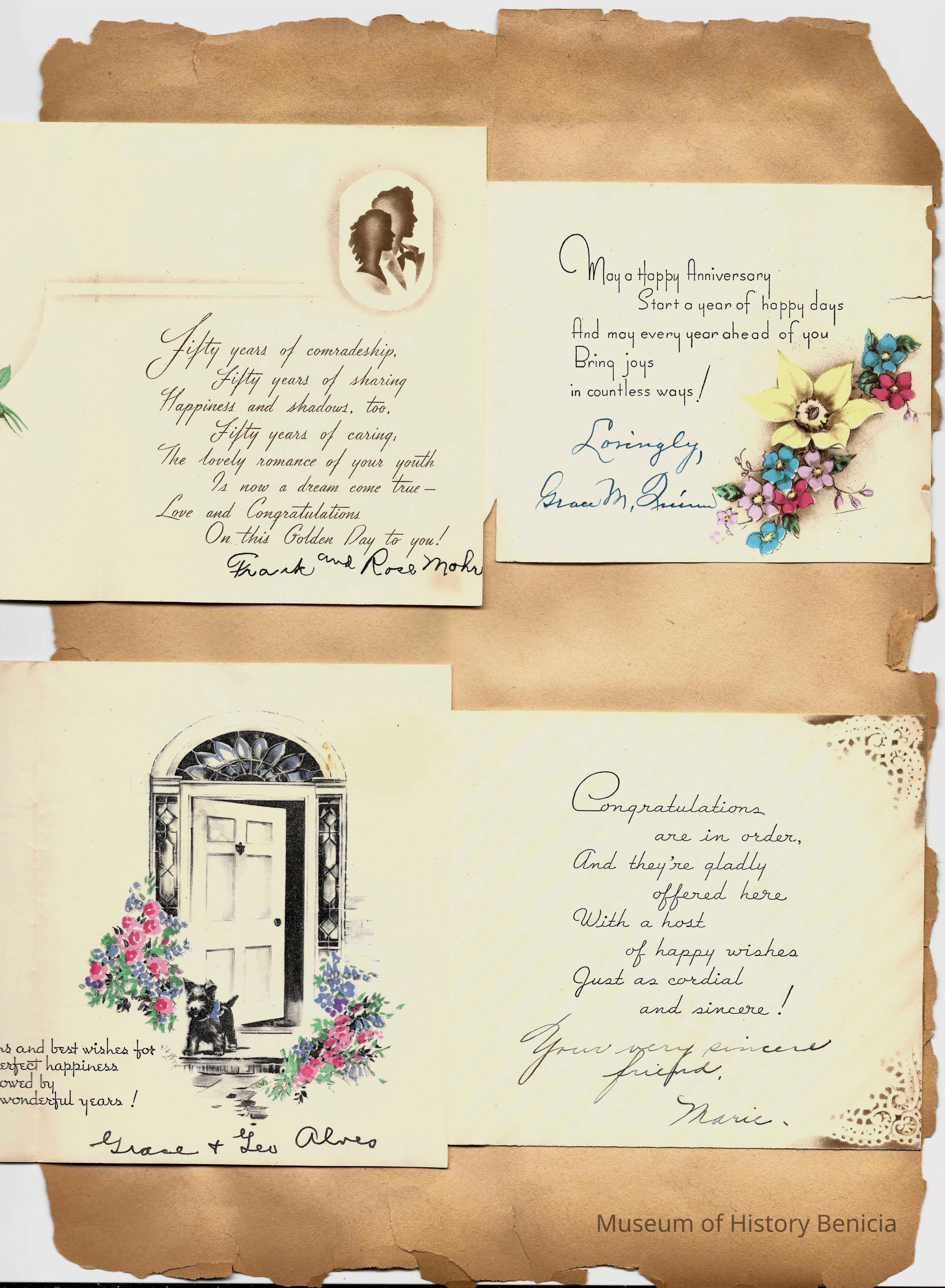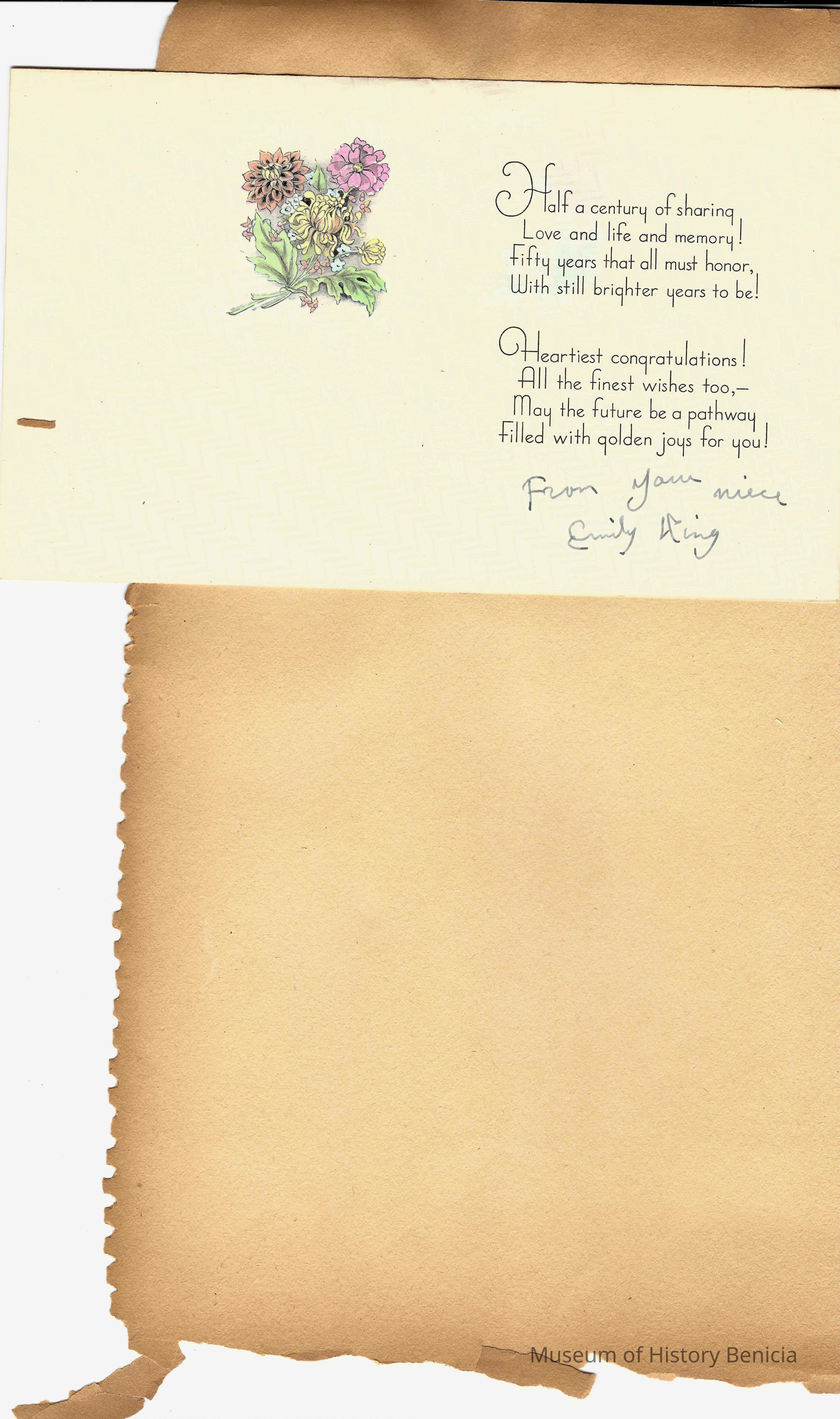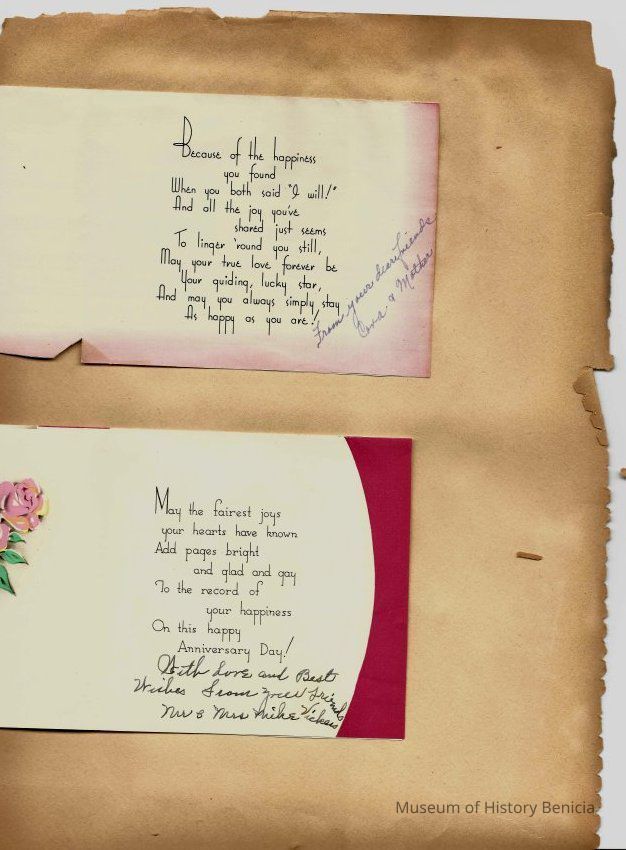 Scrapbook made for the 50th anniversary of Mr & Mrs Joseph DeSilva Sr. The celebration was in 1939 and they were married in 1889. It includes letters, cards, signatures, etc. and an original marriage license for a couple called Silvara.