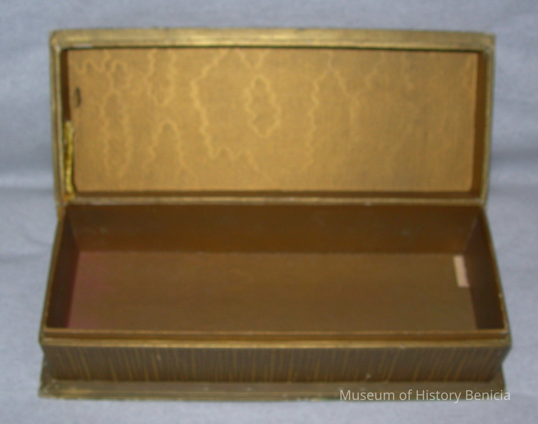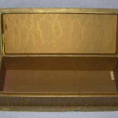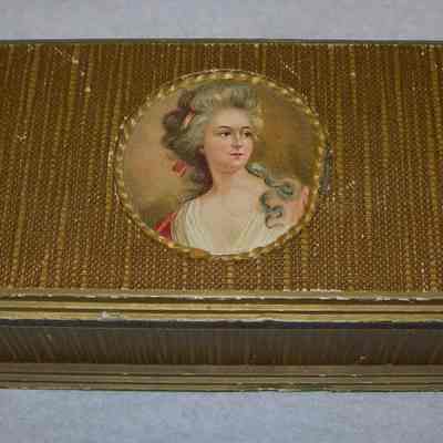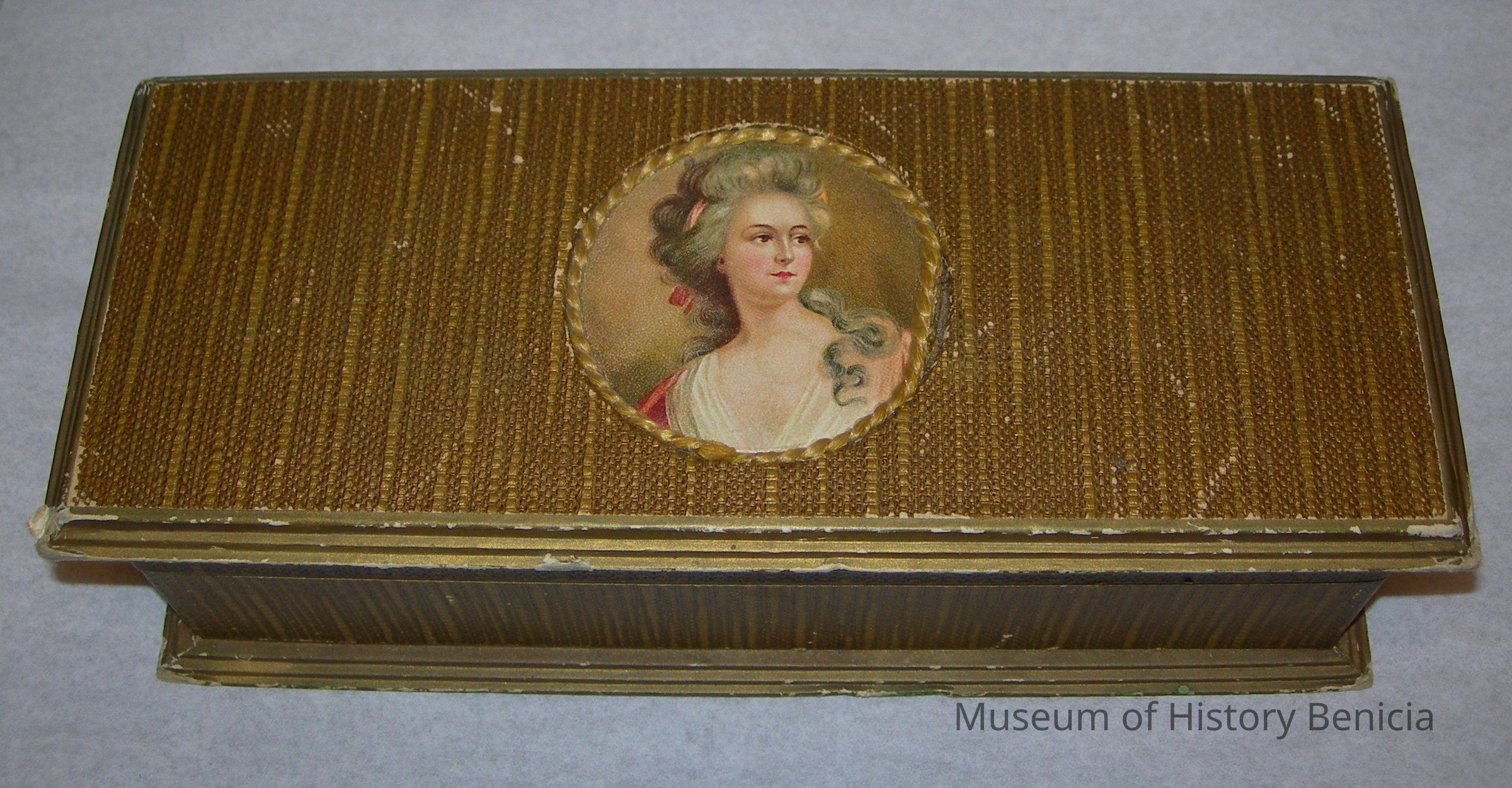 gold colored box of heavy-duty cardboard; portrait of a woman on top in a round opening; lid is hinged [contained a pamphlet, and round soap in a draw-string bag]