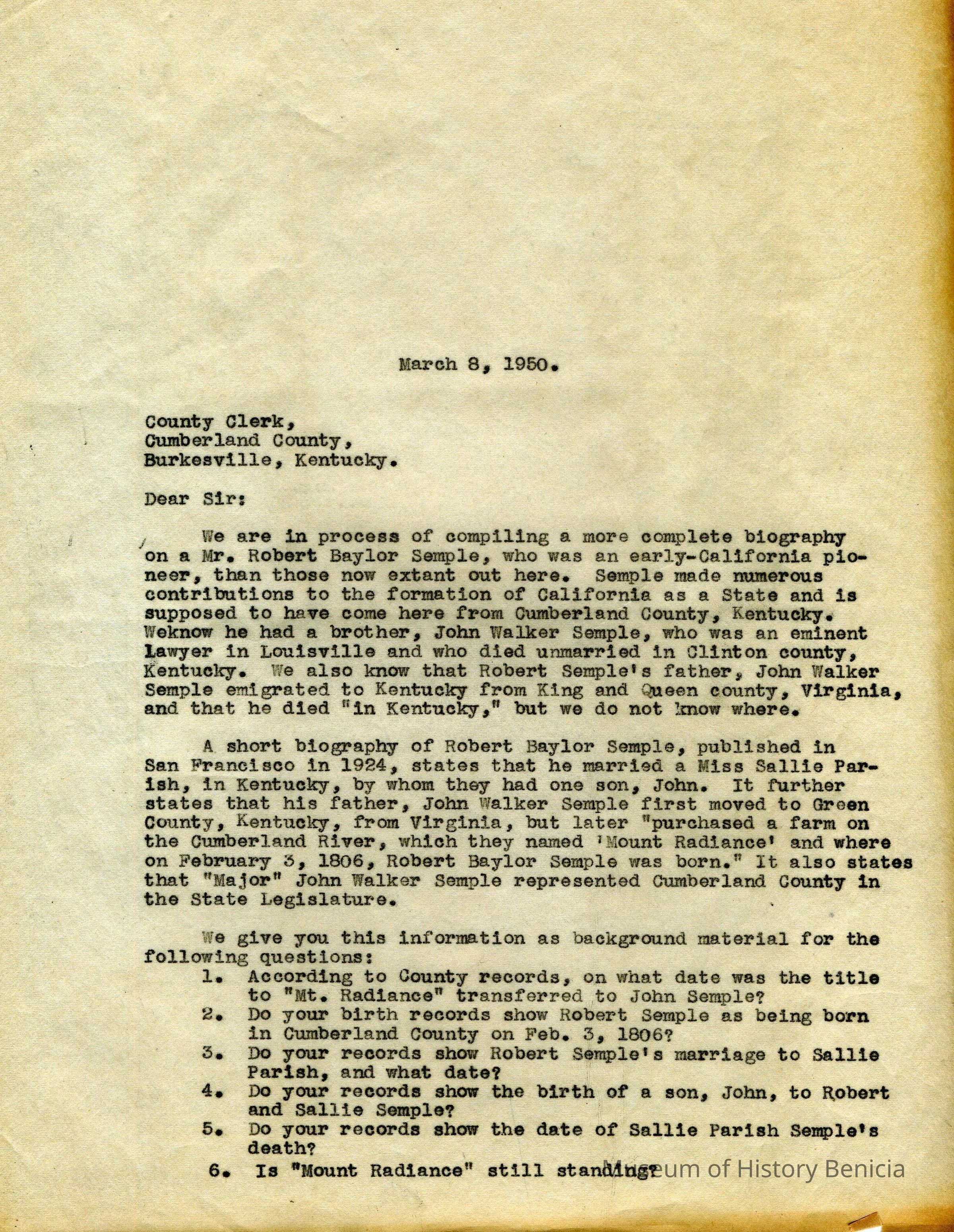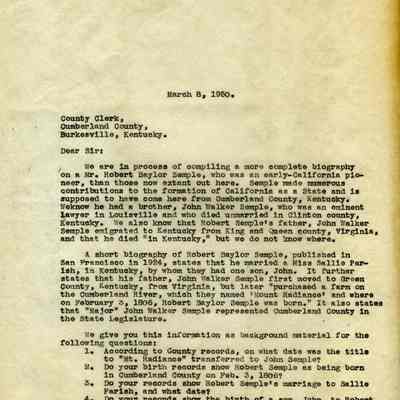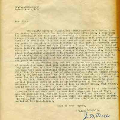 The original letter was written to the County Clerk, Burkesville, Kentucky and given to Judge Wells, who was the local genealogist for that area and had compiled a book on his six years research.Collection