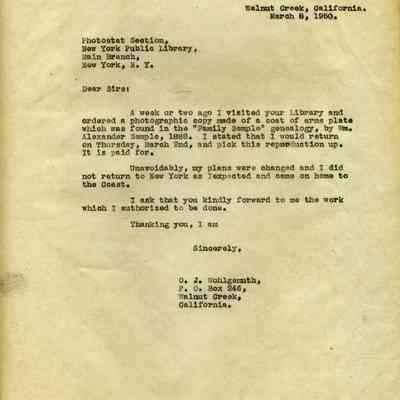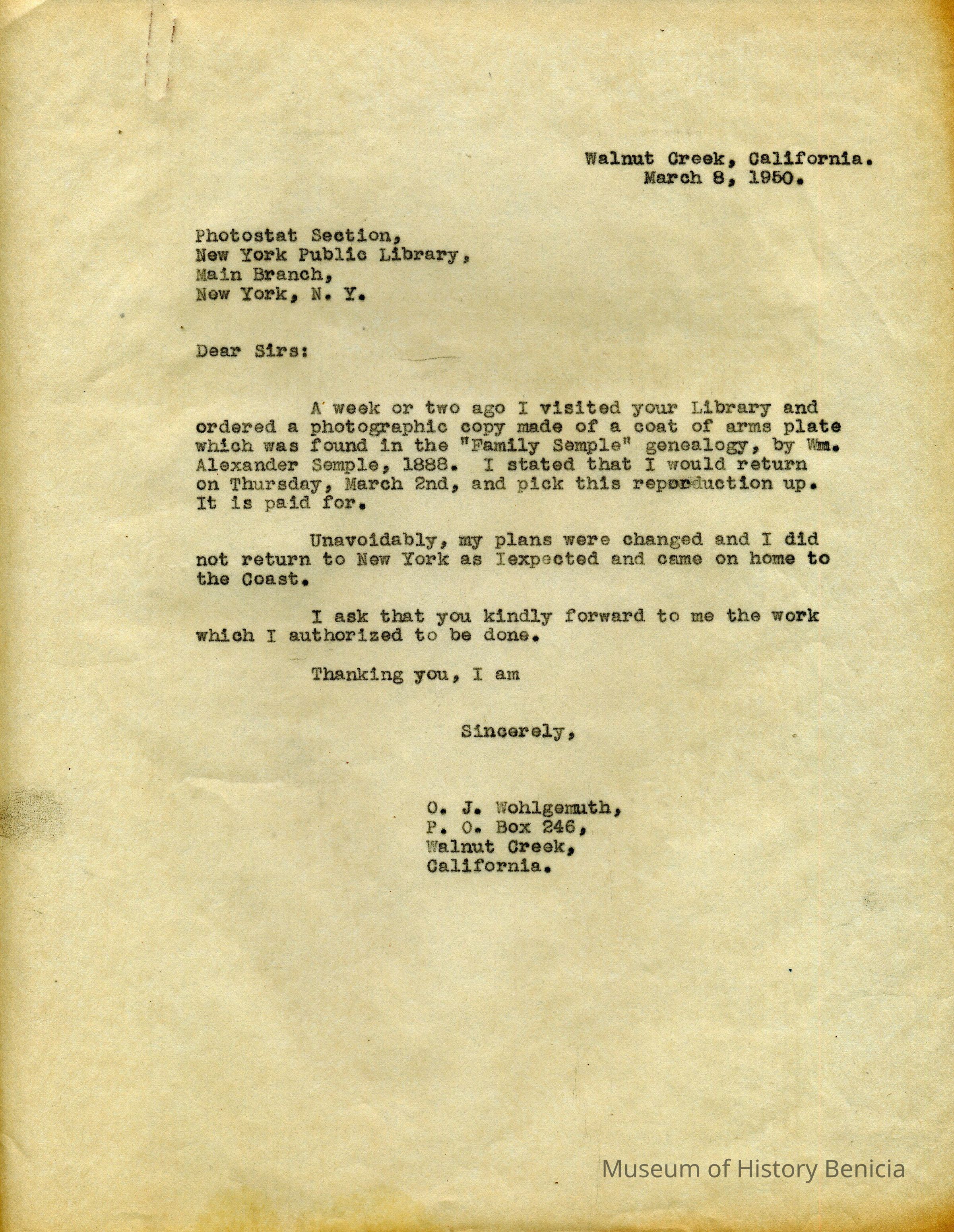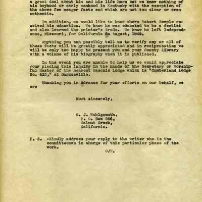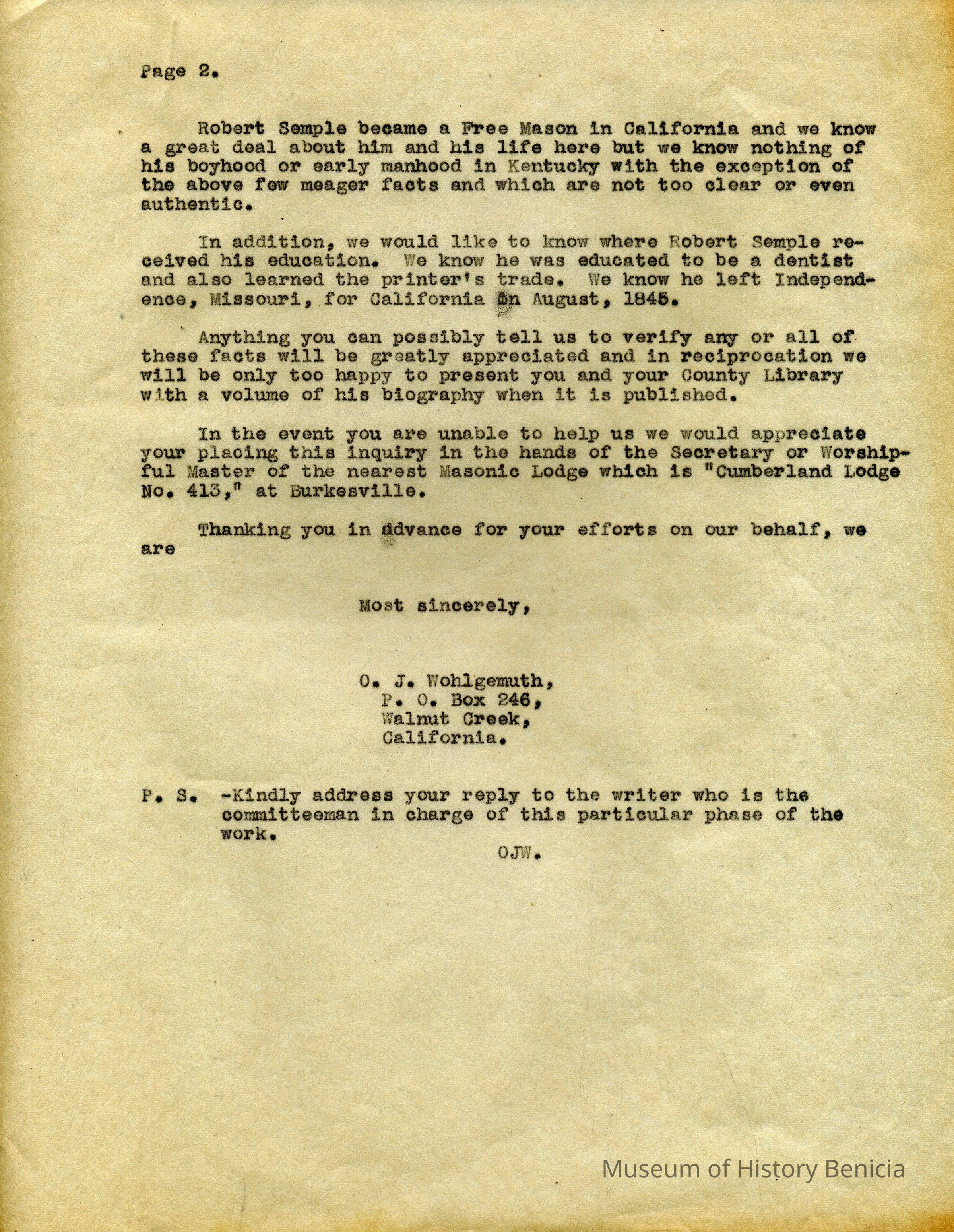 Mr Wohlgemuth was working on compiling a biography of Robert Semple and was seeking information on Robert's early life before he 'came out west'.