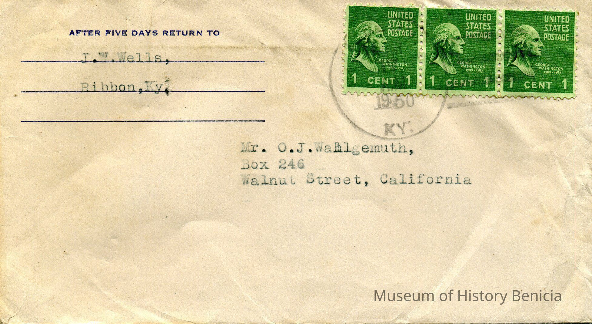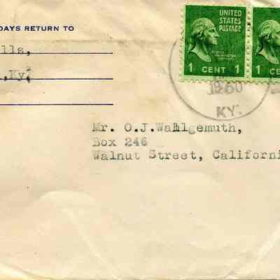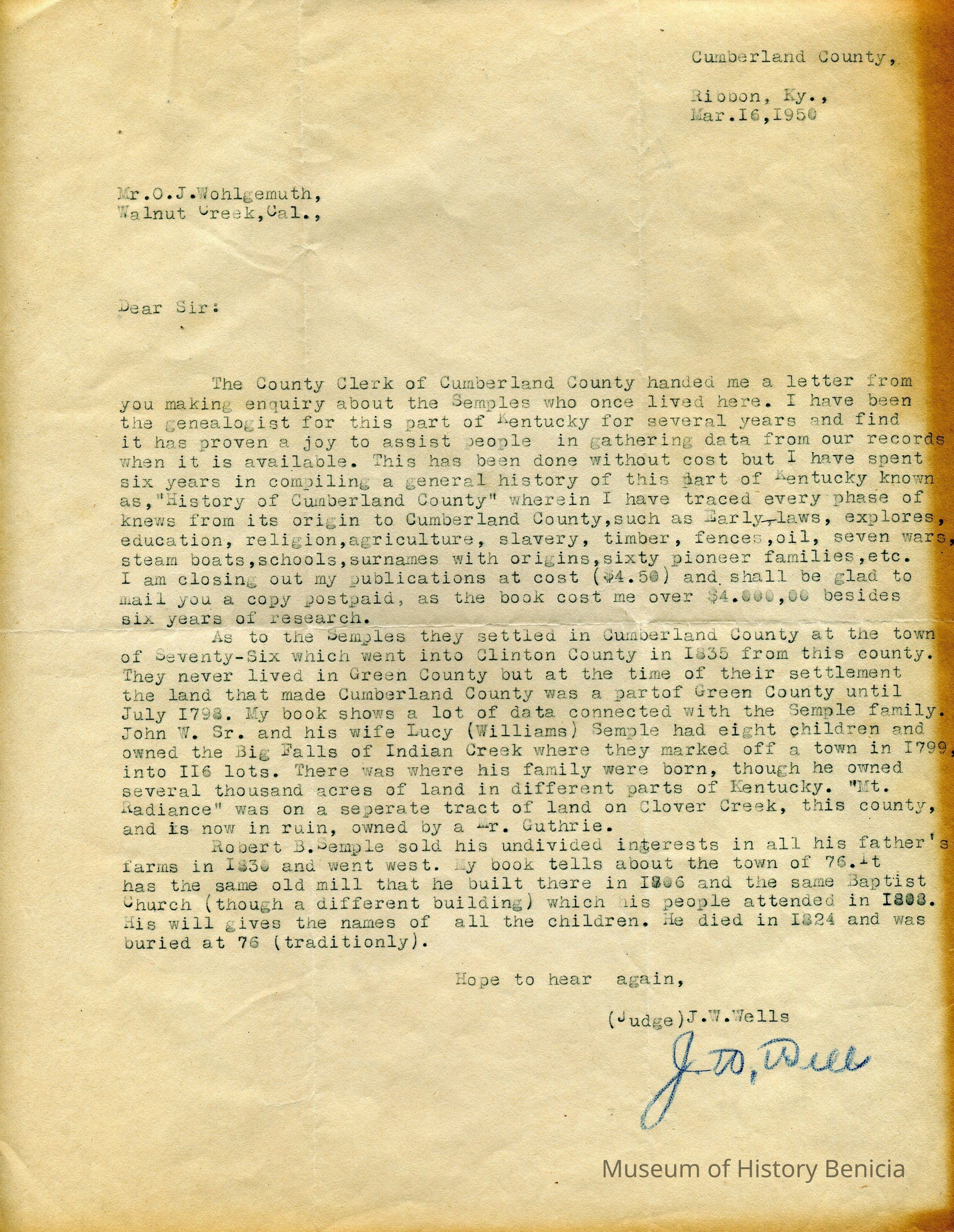 A one page typed letter from Judge J. W. Wells, Ribbon, Ky to Mr O.J.Wohlgemuth, Walnut Creek, plus copies of the letters initially sent to Judge Wells. The stamped envelope is included.