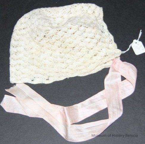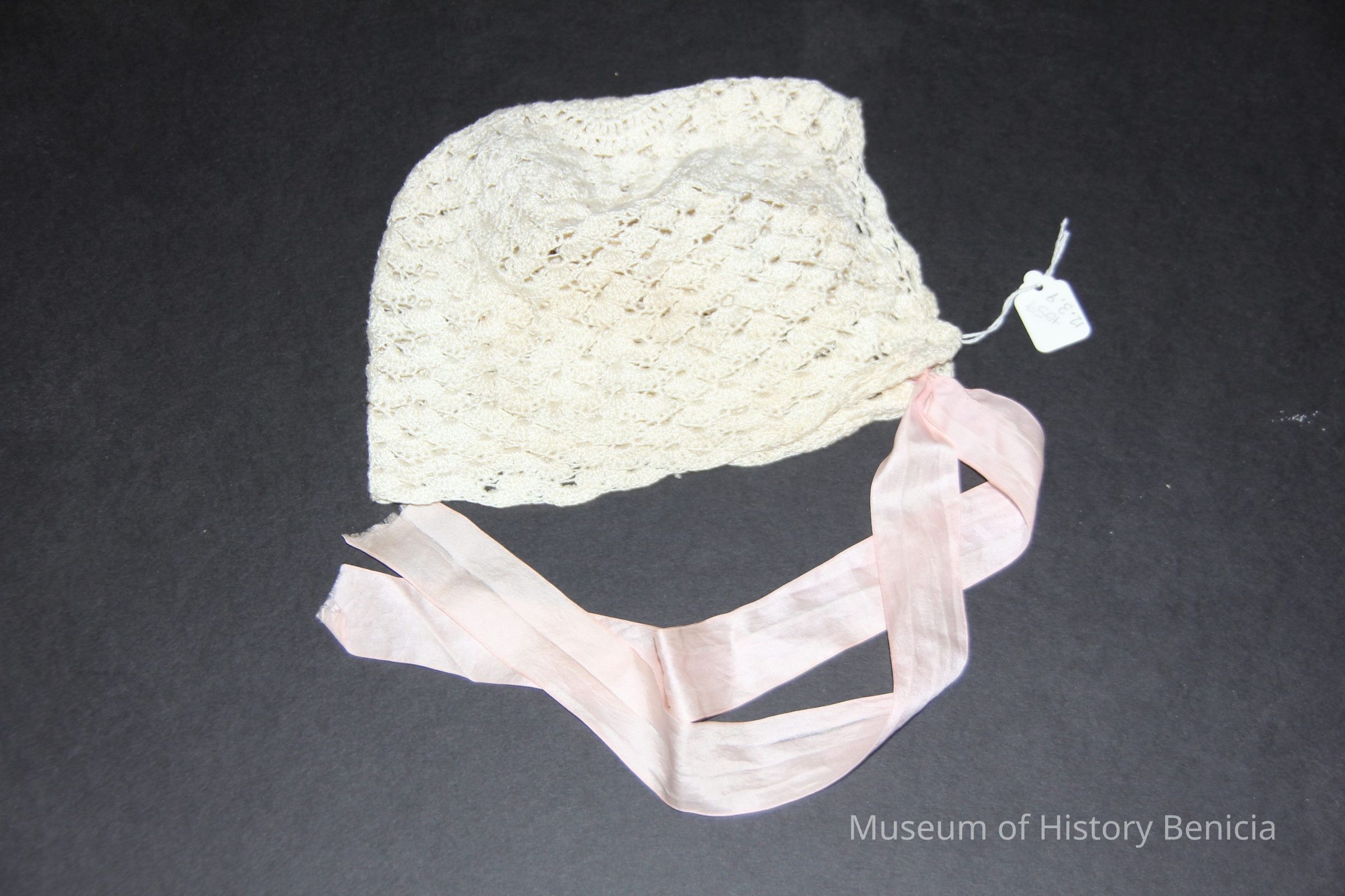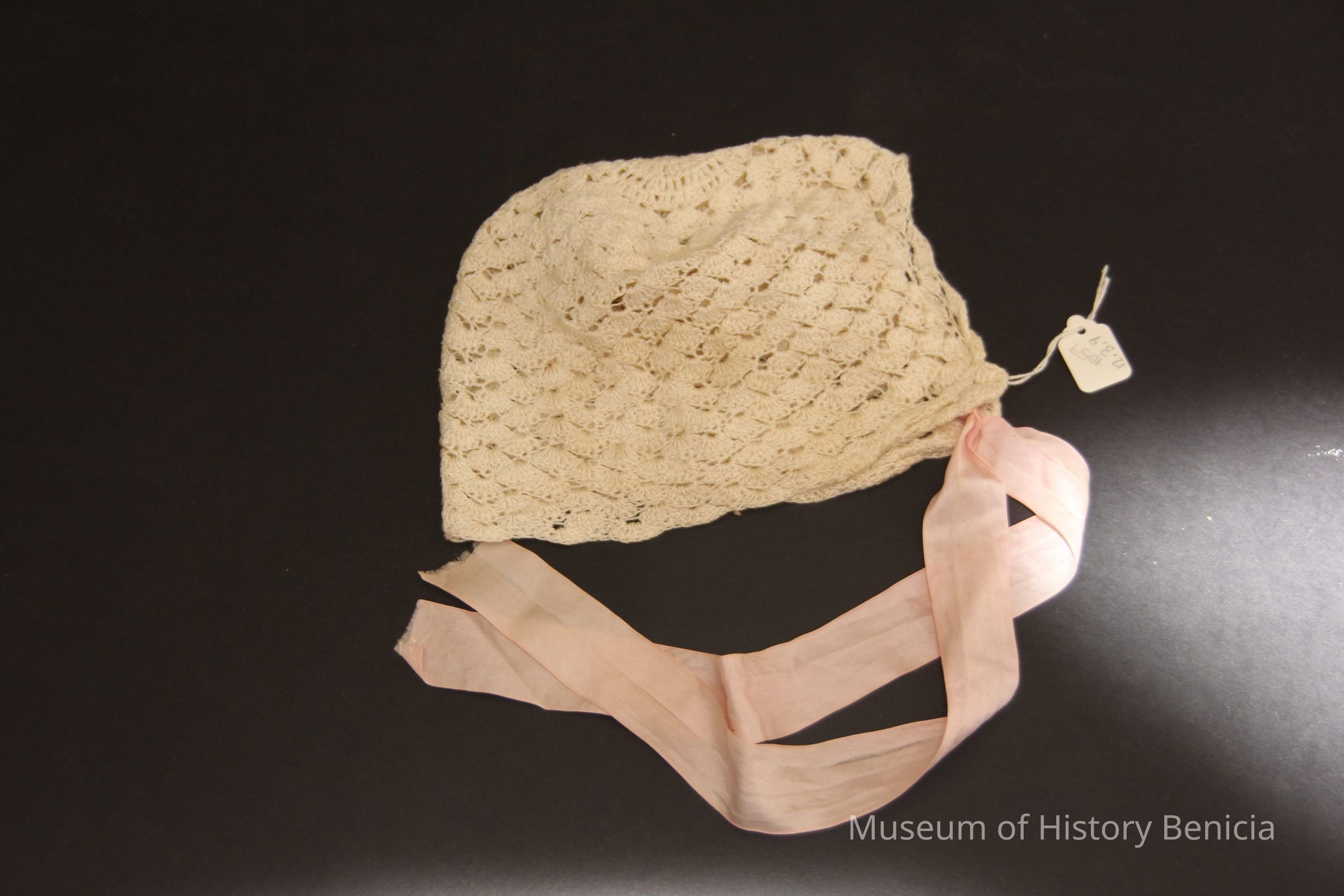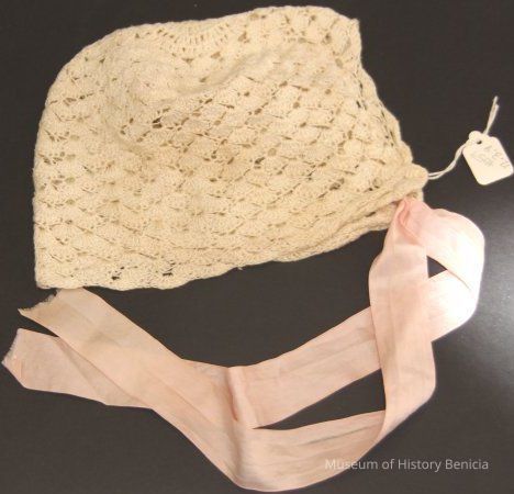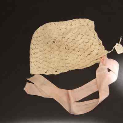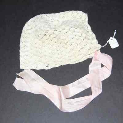 Baby bonnet ecru lace with pink ties.