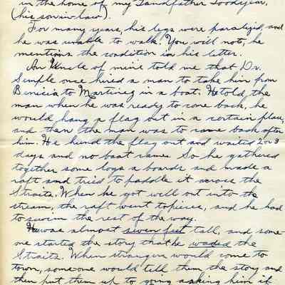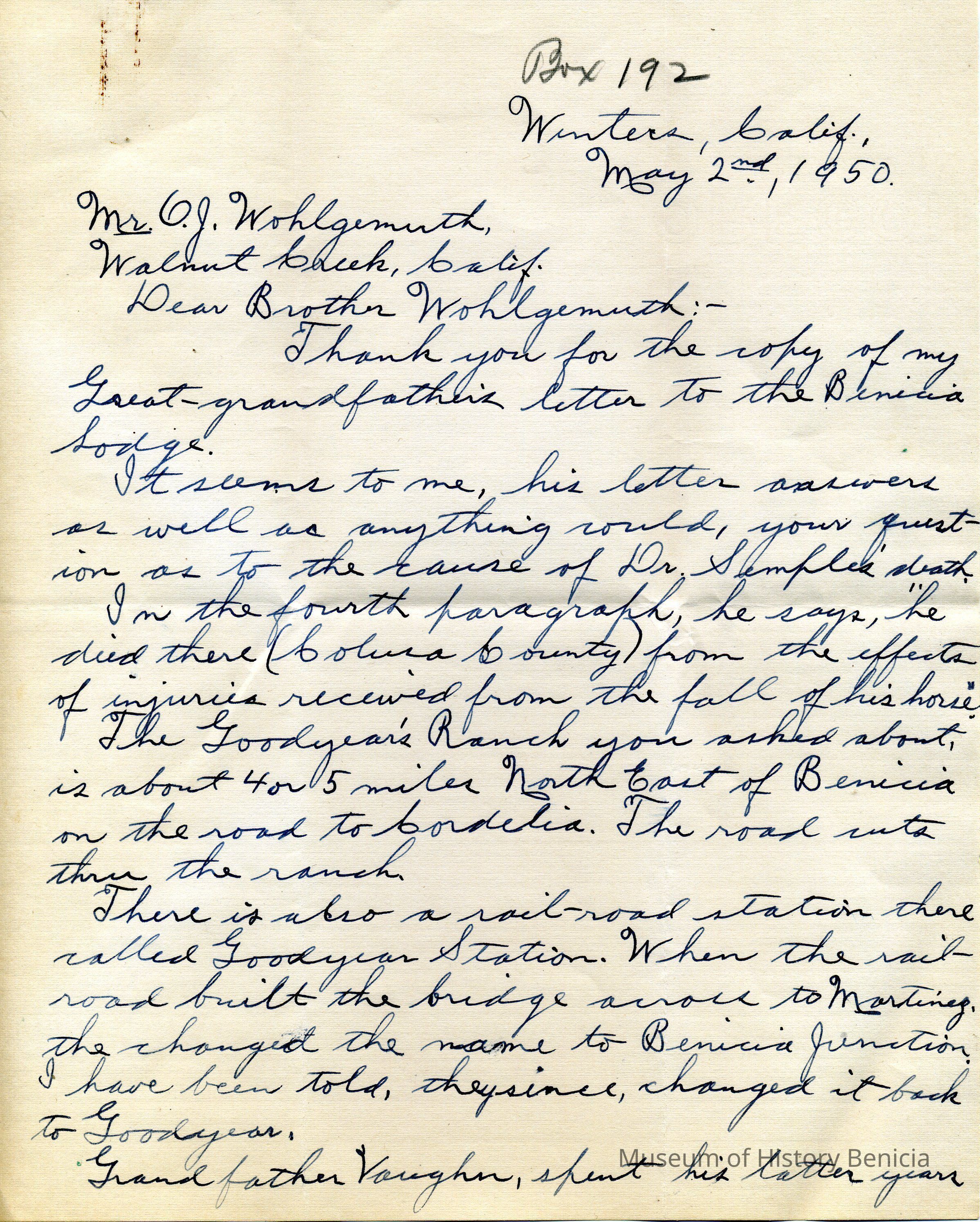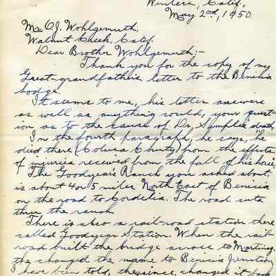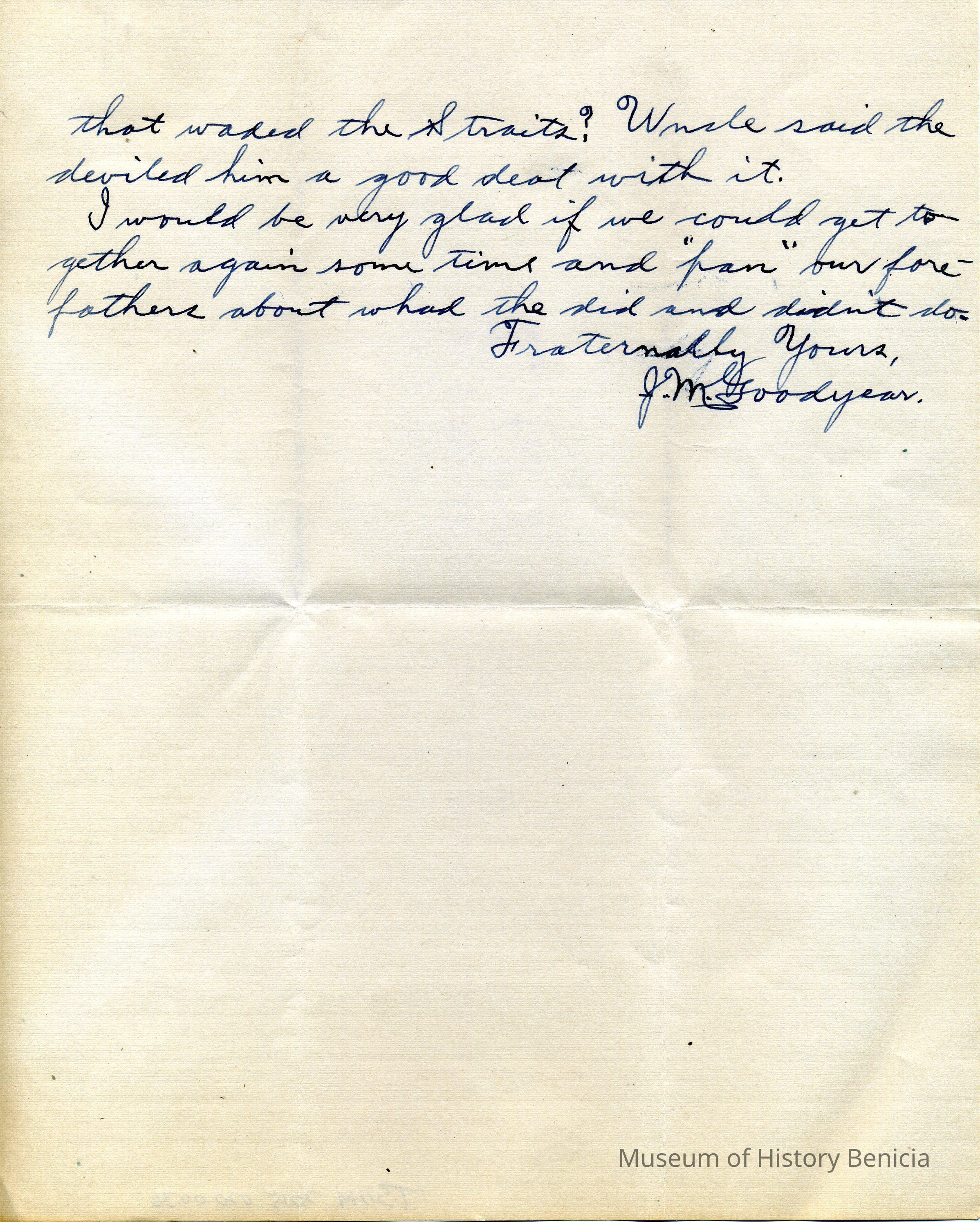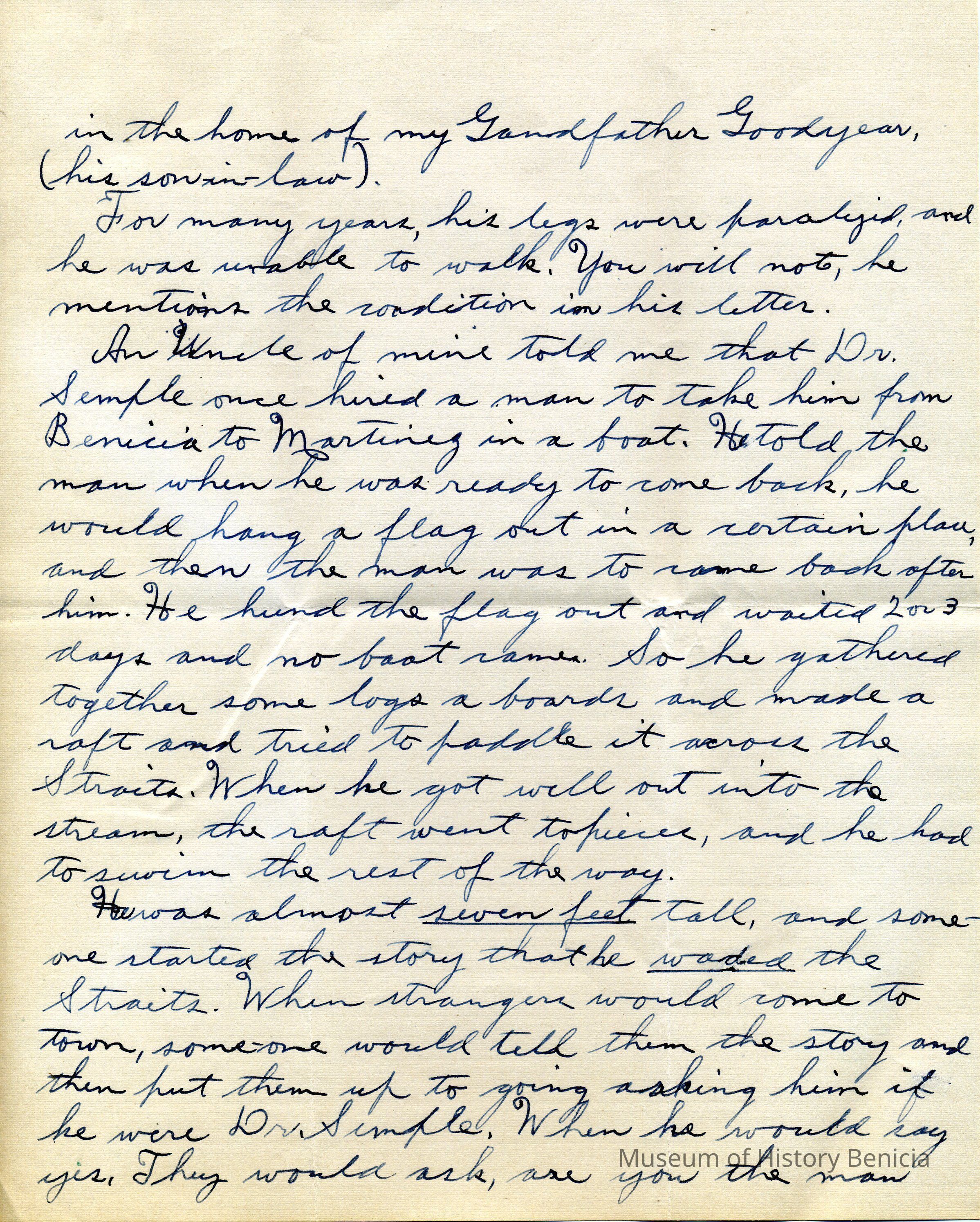 Letter to O. J. Wohlgemuth, Walnut Creek from J.M. Goodyear, Winters, CA relaying some details of the last few years of Dr Semple's life and death plus details of the facts of a now legend on how Dr Semple crossed the Martinez straight.