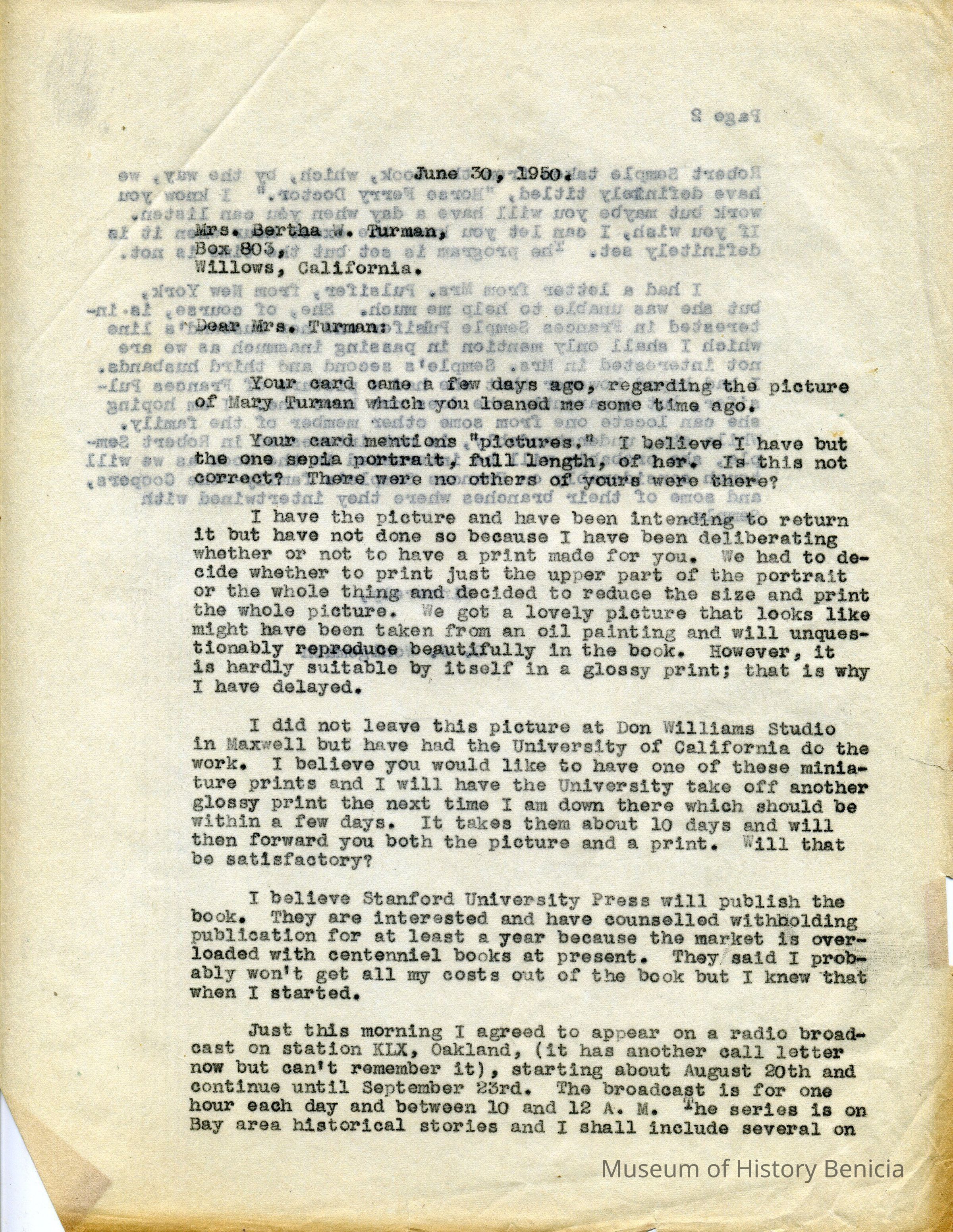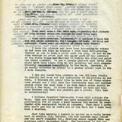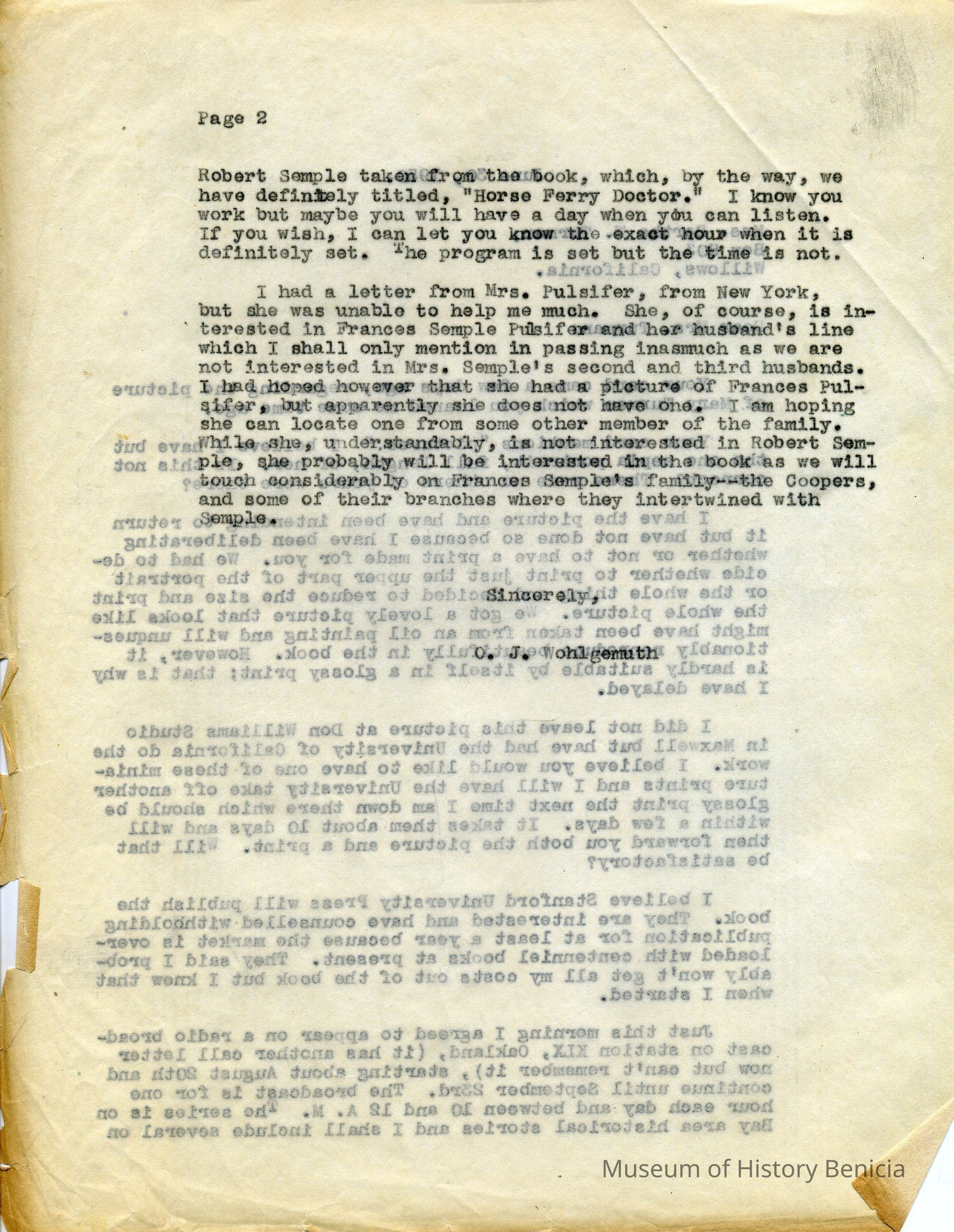 Letter from O. J. Wohlgemuth, Walnut Creek to Bertha Turman, Willows, California, regarding a photograph, a recent visit, and information on the final details of his work on Dr Robert Semple.