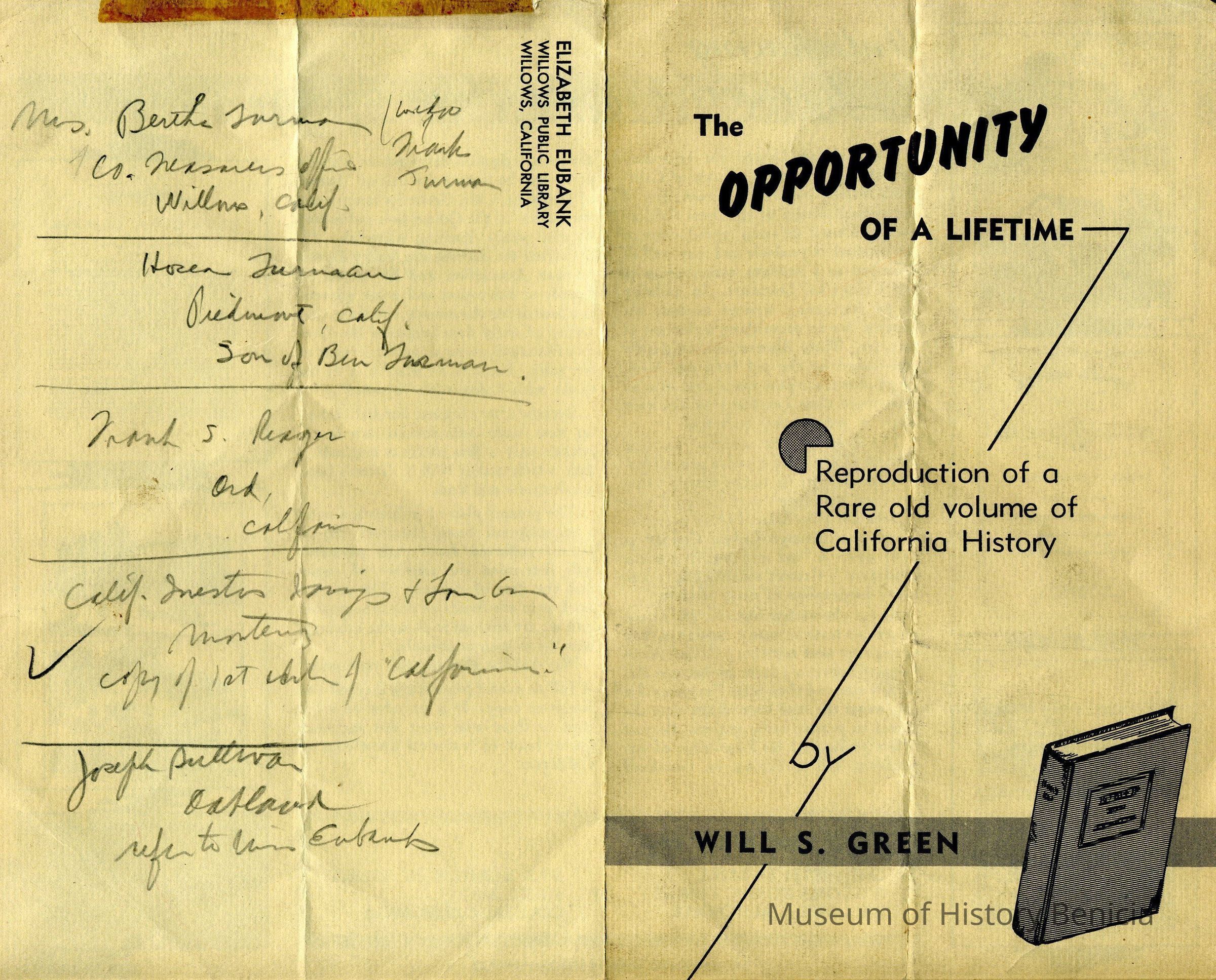 Brochure introducing Will S Green's History of Colusa County. On the back are several names/addresses previously mentioned in this series.