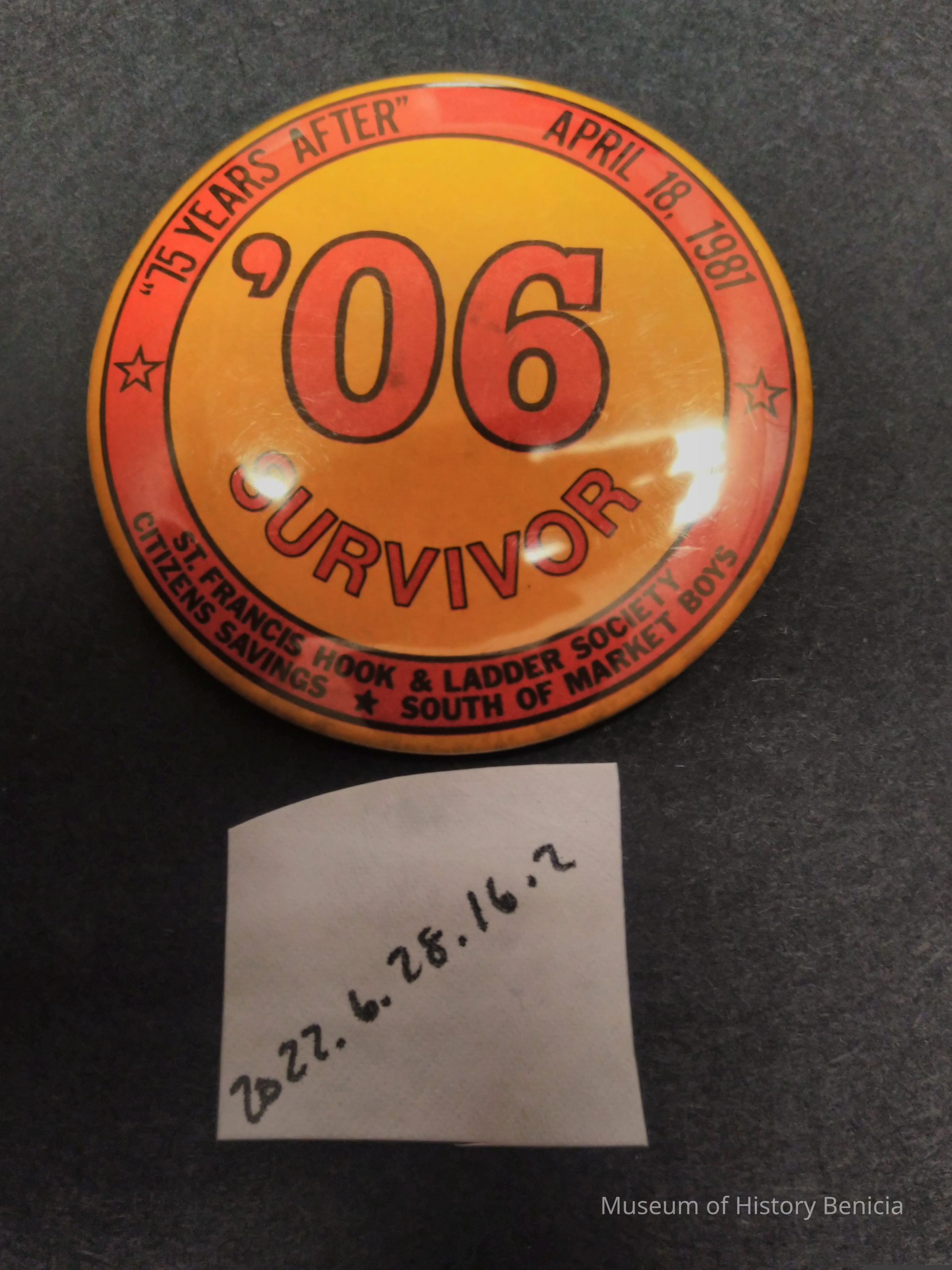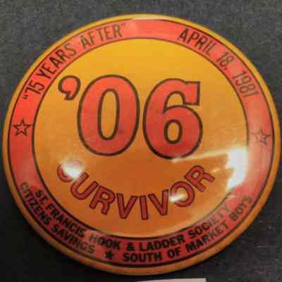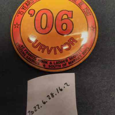 Red and Orange 1906 Commemorative Pin - 75 Years After April 18, 1981 '06 Survivor St. Francis Hook and Ladder Society Citizens Savings, South of Market Boys