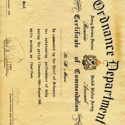 A certificate given to Robert H. Mann by the Benicia Arsenal. He is commended by the Chief of Ordanance for outstanding performance of duty during the period 12/7/1941 - August, 1945 while serving as Chief Clerk.Collection