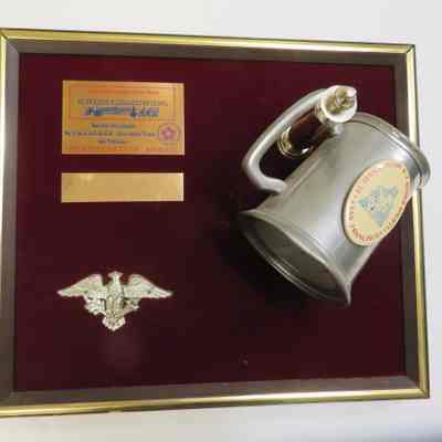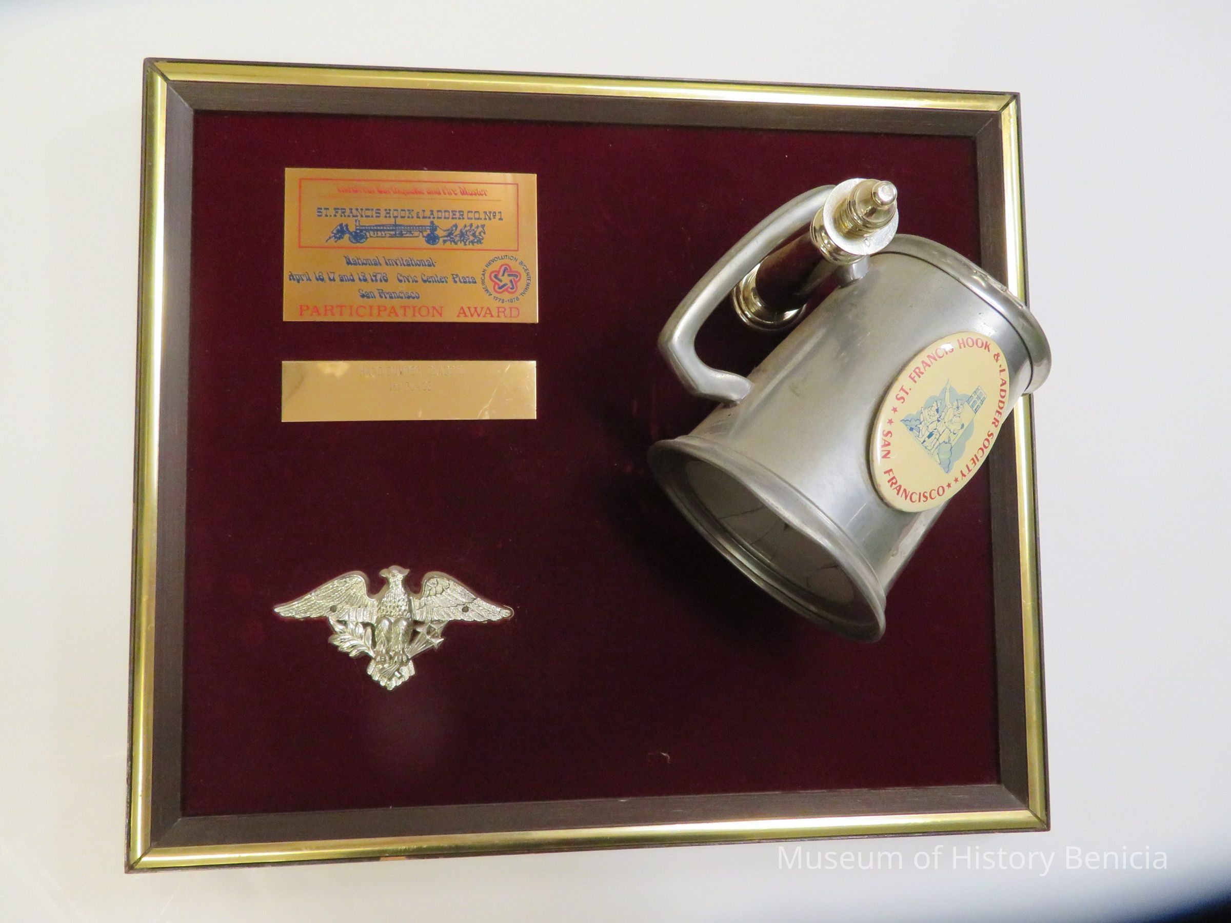 Plaque: burgundy with gold frame and beer mug.