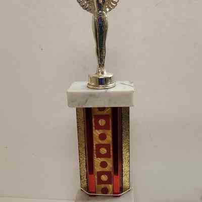 Trophy of metal, plastic and marble with winged victory on top level; center column is red and gold; plate reads - 1974 Suisun Valley Fireman's Muster 1st Womens Hose Cart