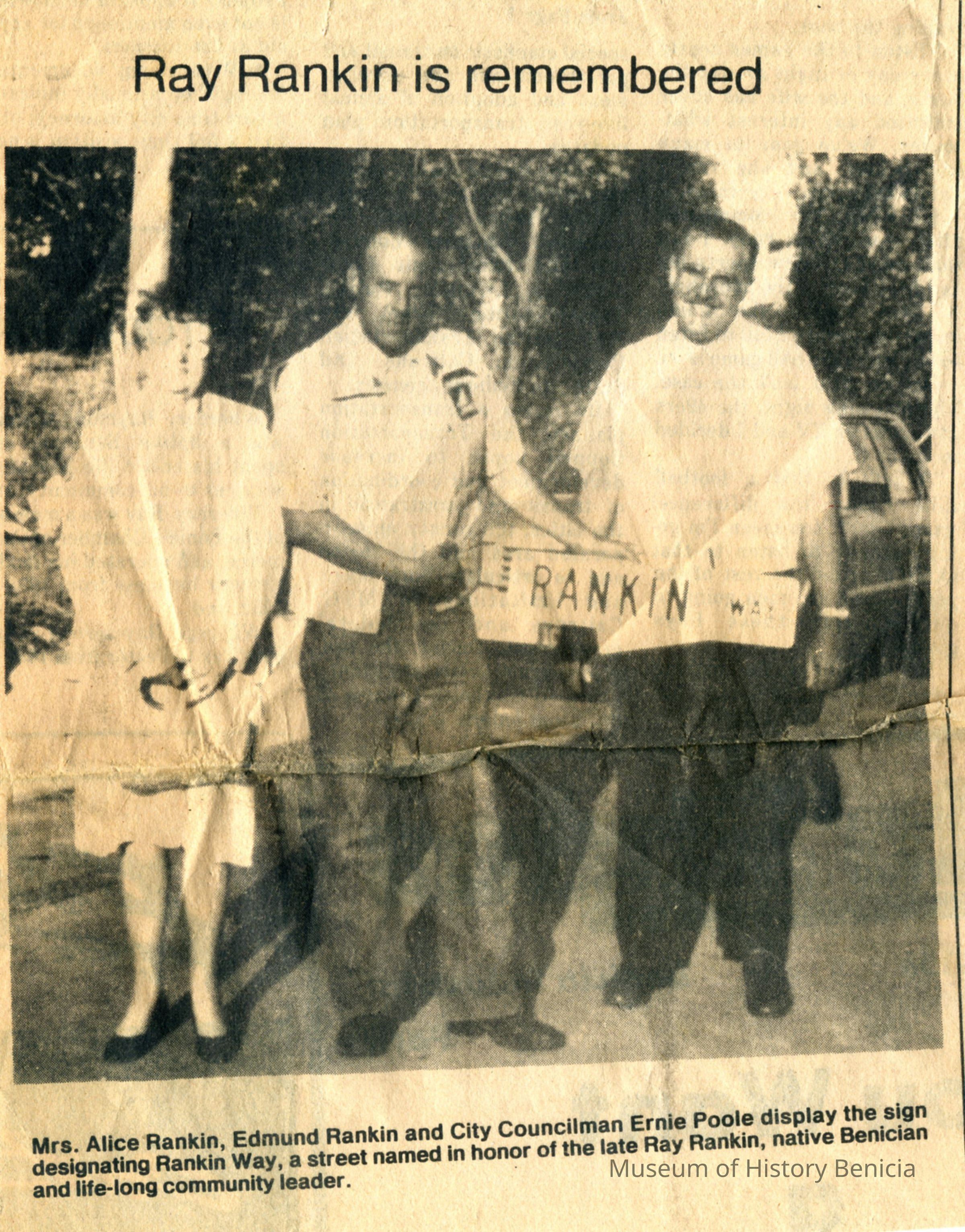 This is an article from the Benicia Herald announcing the naming of a street in honor of Raymond Rankin, Rankin Way.
