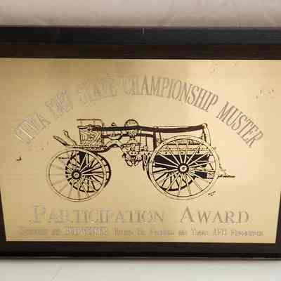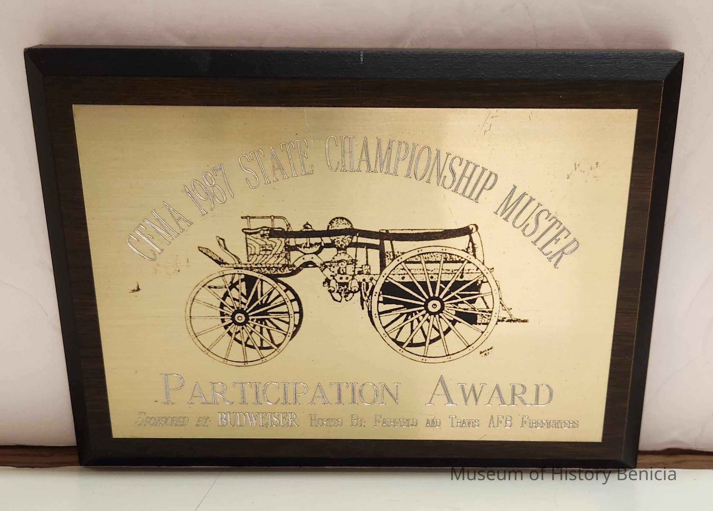 Wooden plaque with metal plate that has etched lettering and a decal of a fire pumper