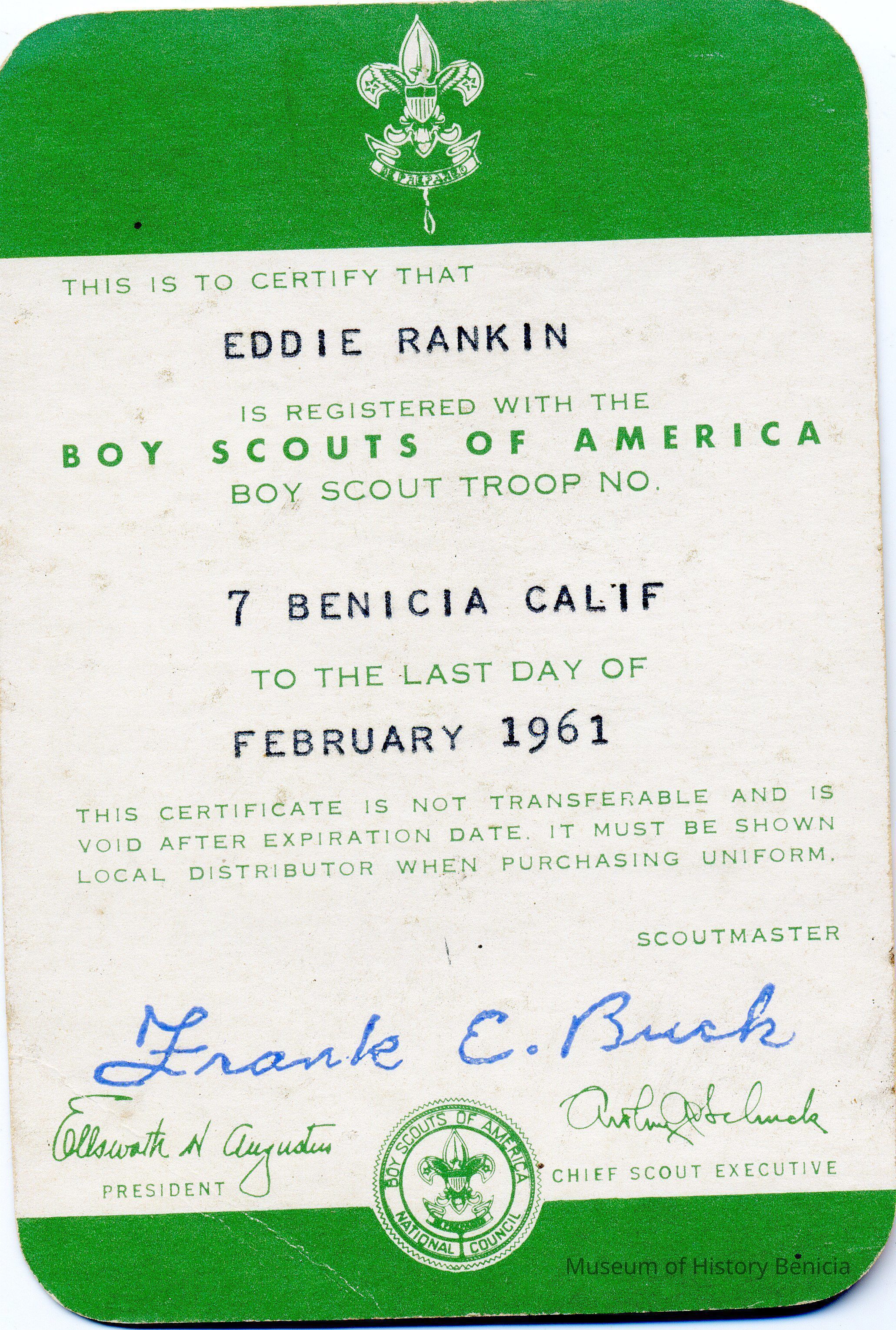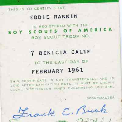 This is membership card showing that Eddie Rankin is registered with the Boy Scouts of America troop 7 Benicia Cailf as of Feb. 1961.Collection