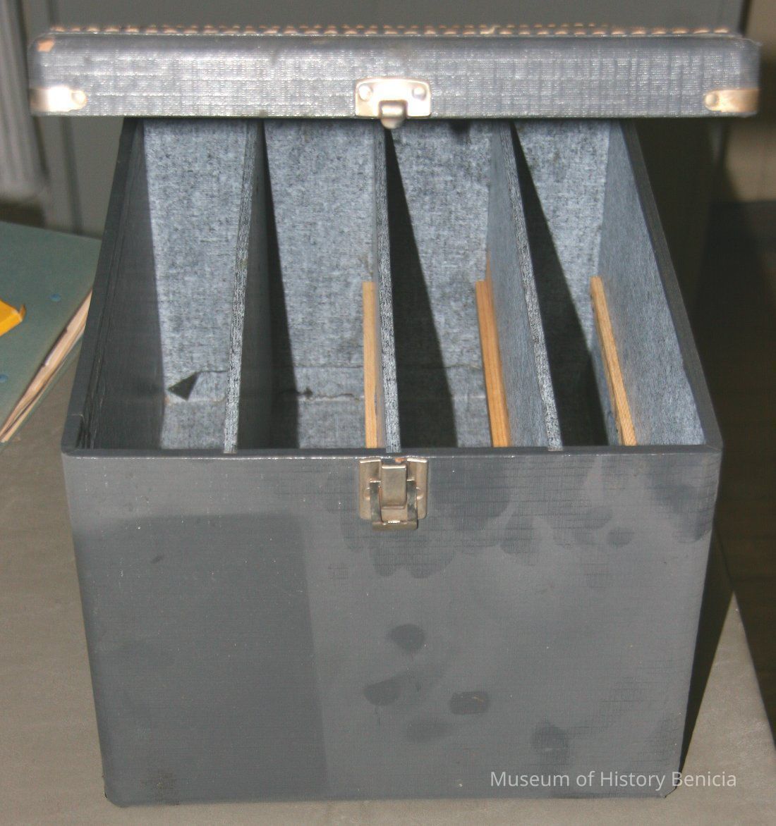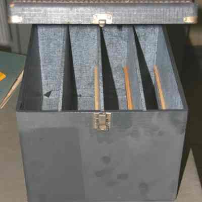 Grey tray storage box with silver clasp, used to store slide trays.